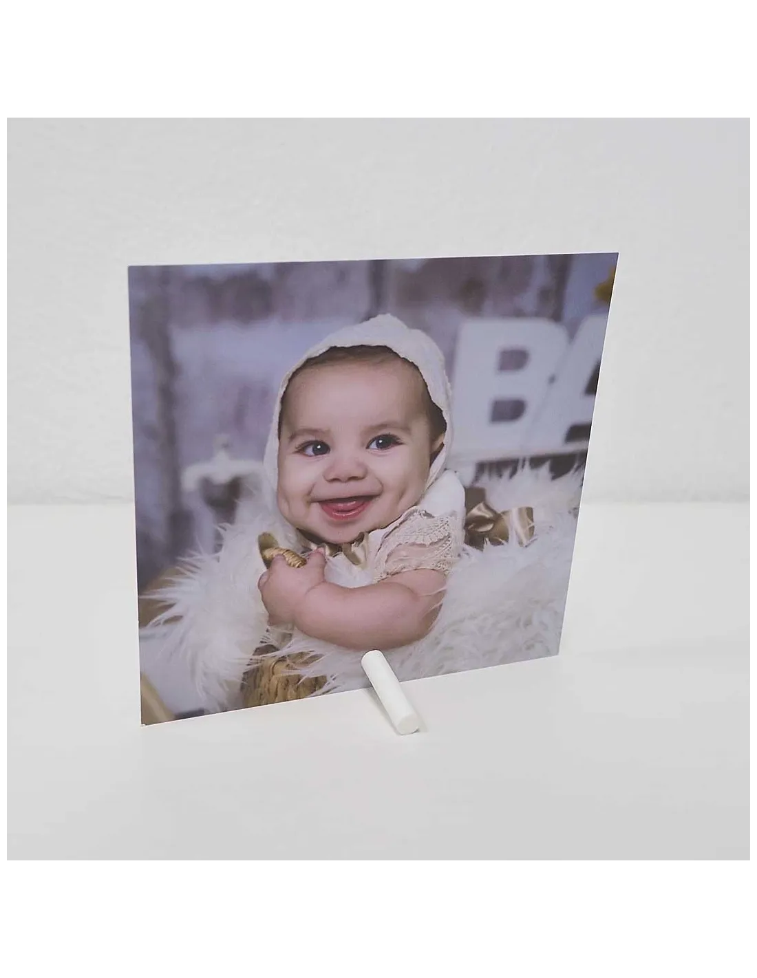 Es un soporte patentado y diseñado por nosotros, que sostiene tus láminas o fotografías de pie con un sistema muy sencillo de dos piezas. Solo haces un pequeño agujero, lo enroscas… y tu recuerdo queda listo para lucirse, incluso por las dos caras.