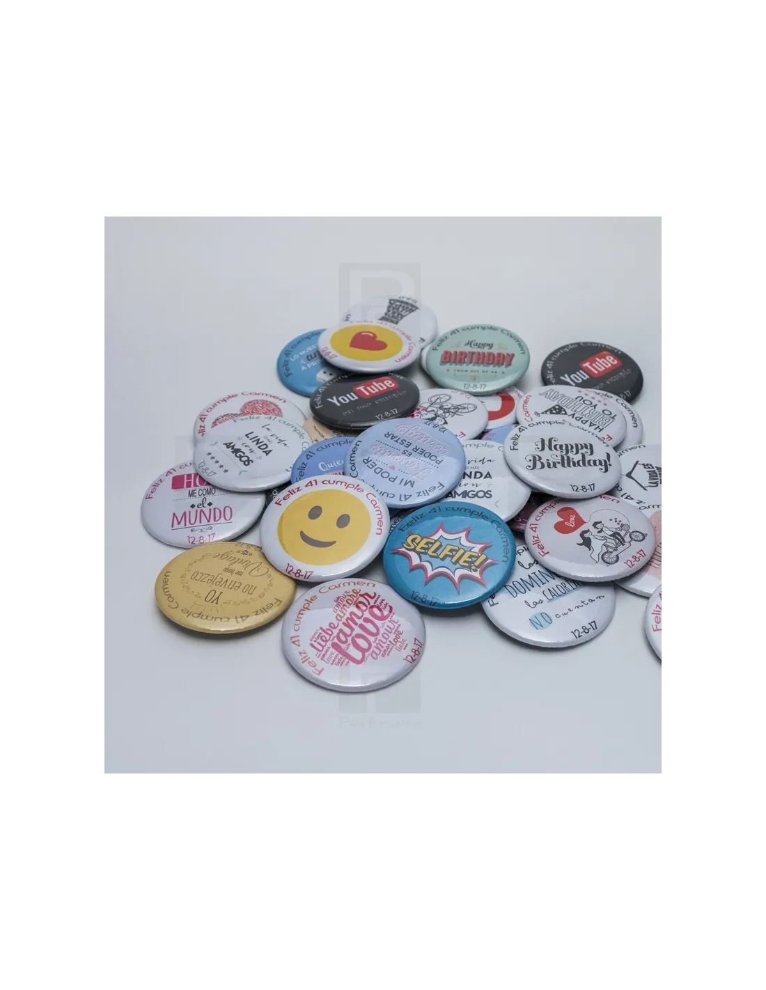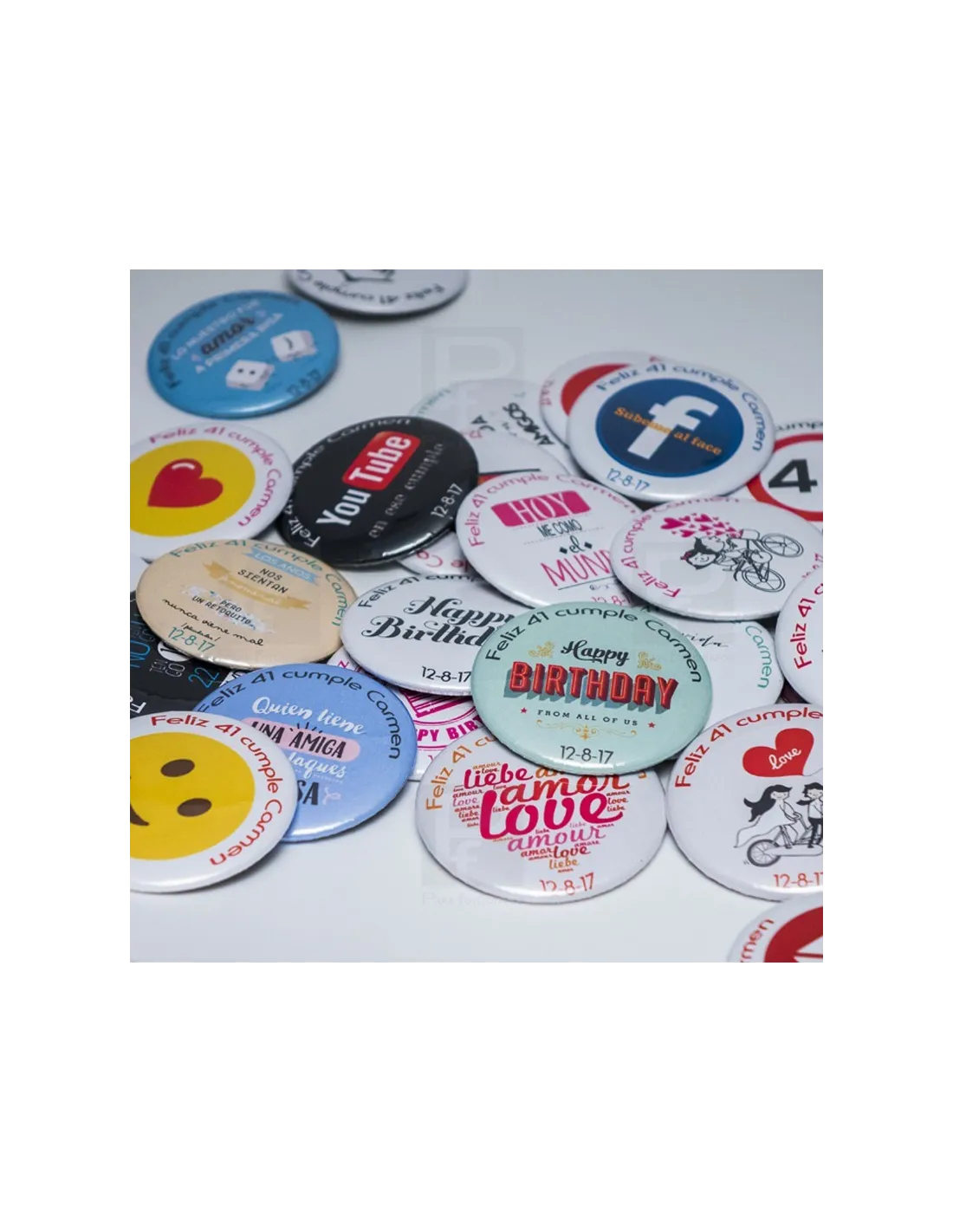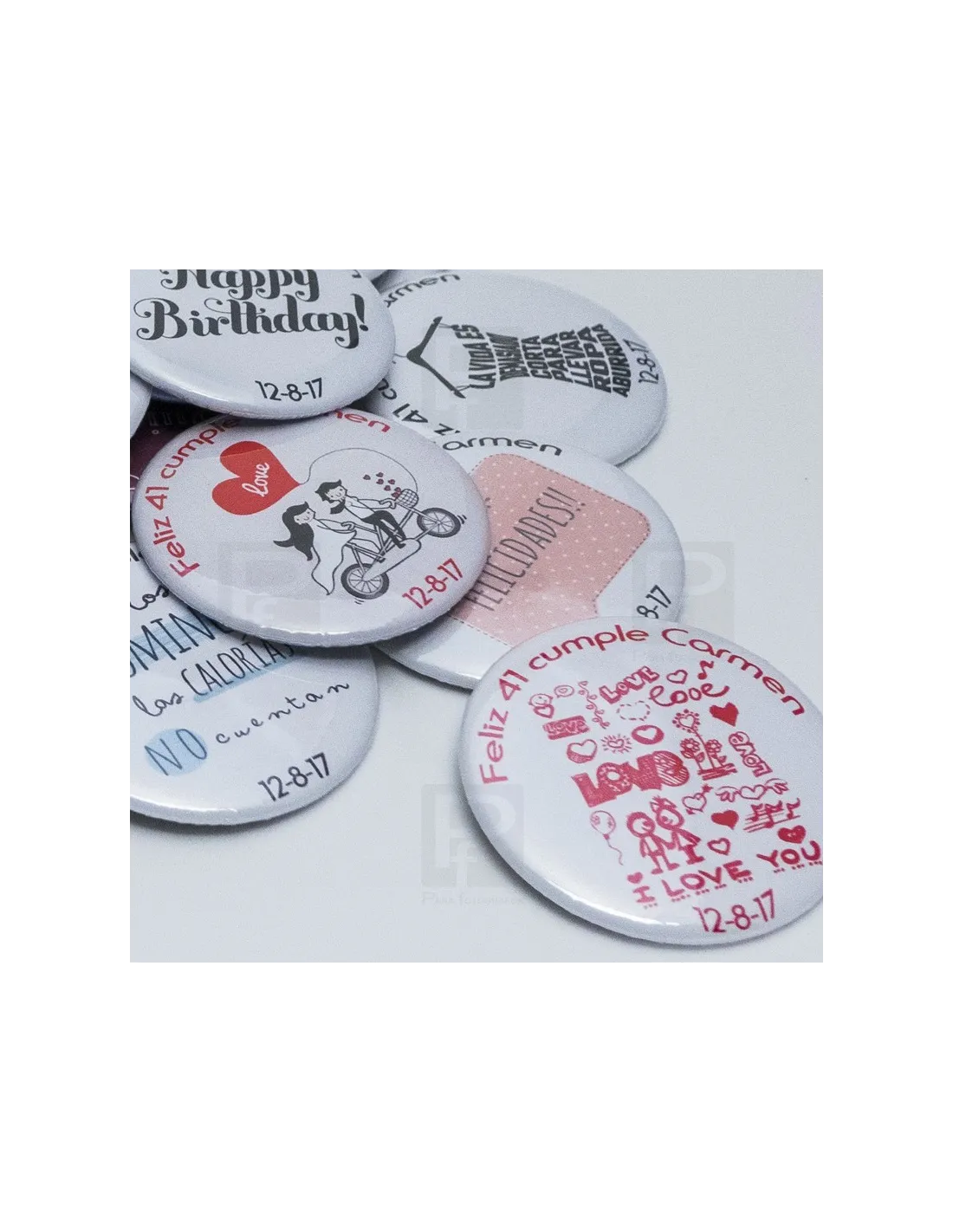 Pack de 50 chapas de 58mm de alfiler solapa para bodas y toda clase de eventos, personalizadas con fecha y nombres todas iguales