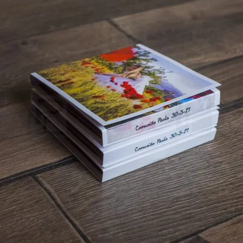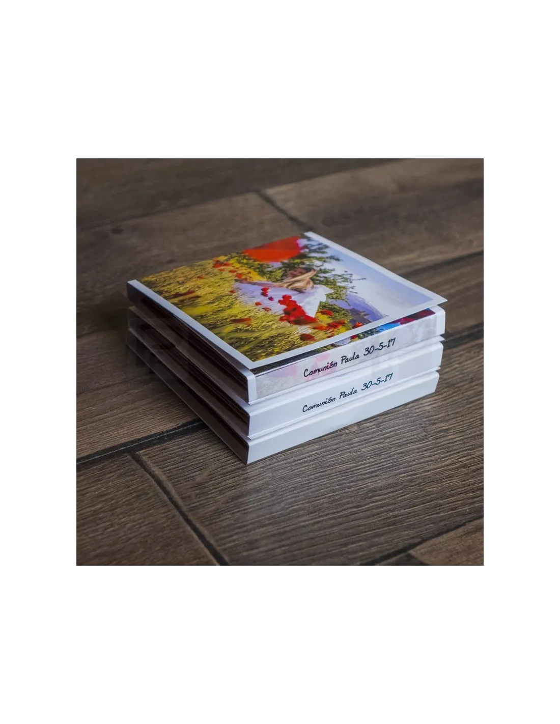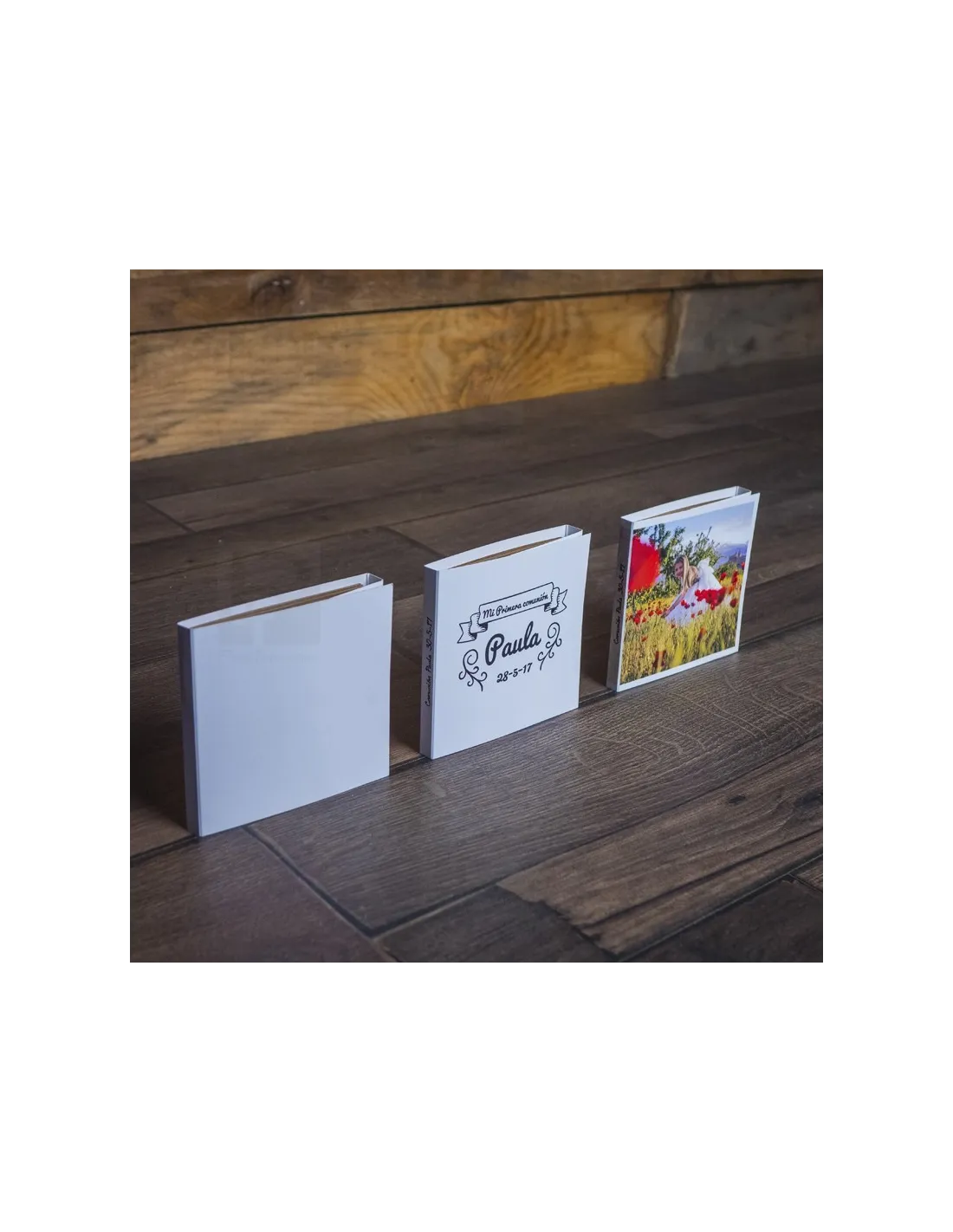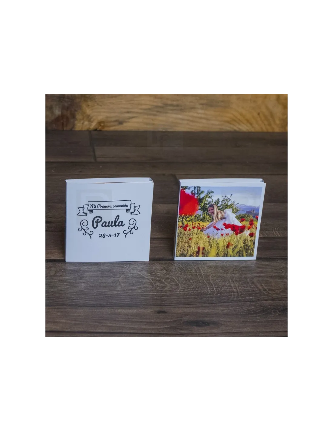 Acordeón con portada en papel 350 gr. blanco, personalizado a todo color de tamaño 11x11cm. Interior en papel kraft de 300gr en acordeón de 10x10 con capacidad a una cara para 6 fotos de 9x9 y a 2 caras capacidad para 11 fotos 9x9cm. Las fotos interiores impresas en papel fotografico Kodak lustre 255gr.