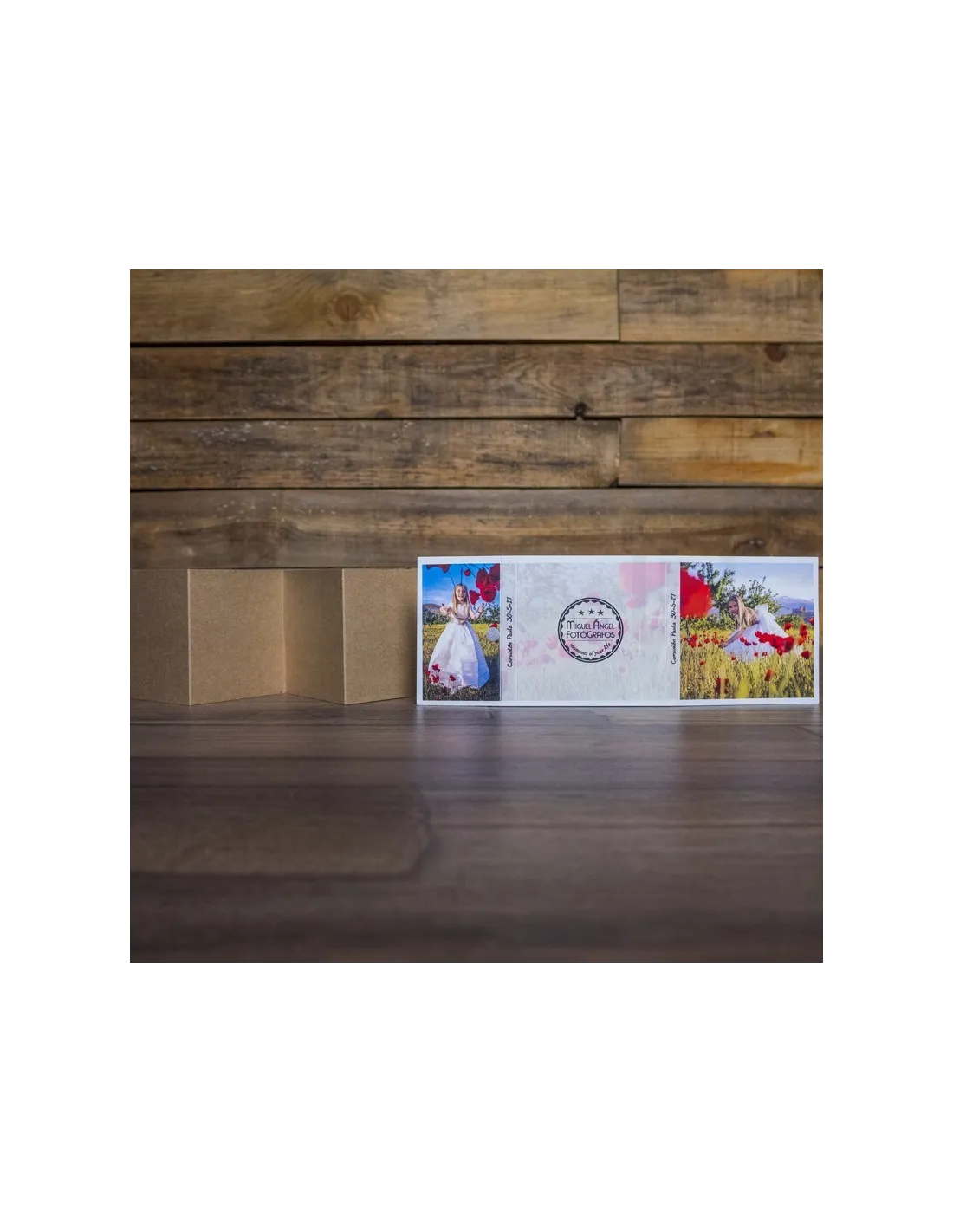 - Formato desplegable o acordeón con 6 o 11 fotos montadas en un desplegable, que se puede imprimir a color o en negro en la portada del desplegable que cierra la carterilla con los recordatorios comunión con cierre belcro. Se queda como un pequeño libreto cerrado y que se puede guardar como un recuerdo de mi primera comunión bonito y que conmemore el día tan especial de la primera comunión de tu hijo o hija.