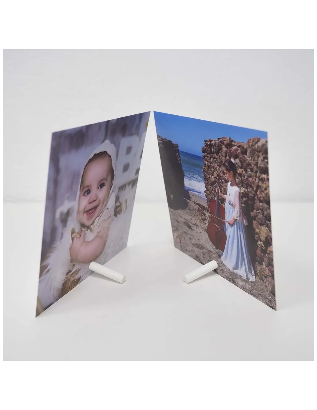 Es un soporte patentado y diseñado por nosotros, que sostiene tus láminas o fotografías de pie con un sistema muy sencillo de dos piezas. Solo haces un pequeño agujero, lo enroscas… y tu recuerdo queda listo para lucirse, incluso por las dos caras.