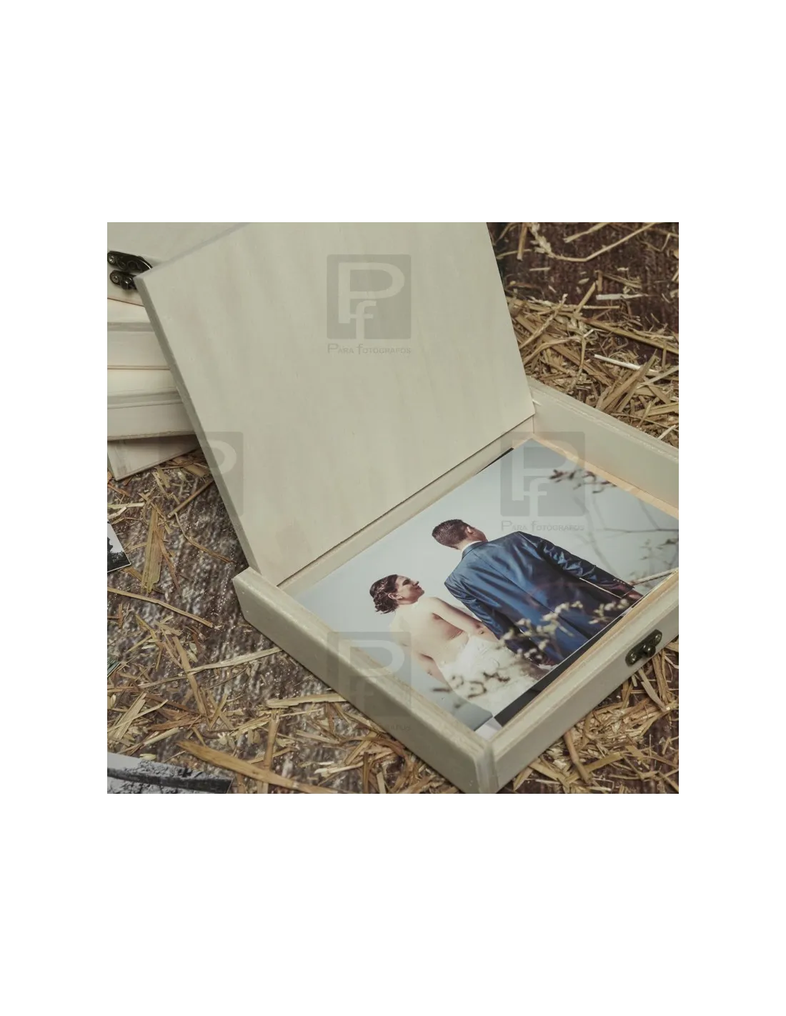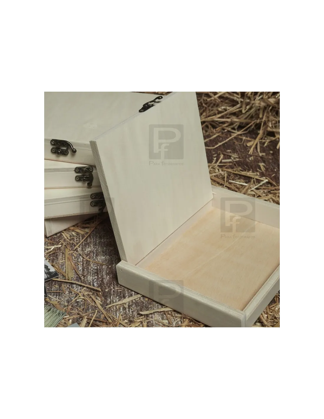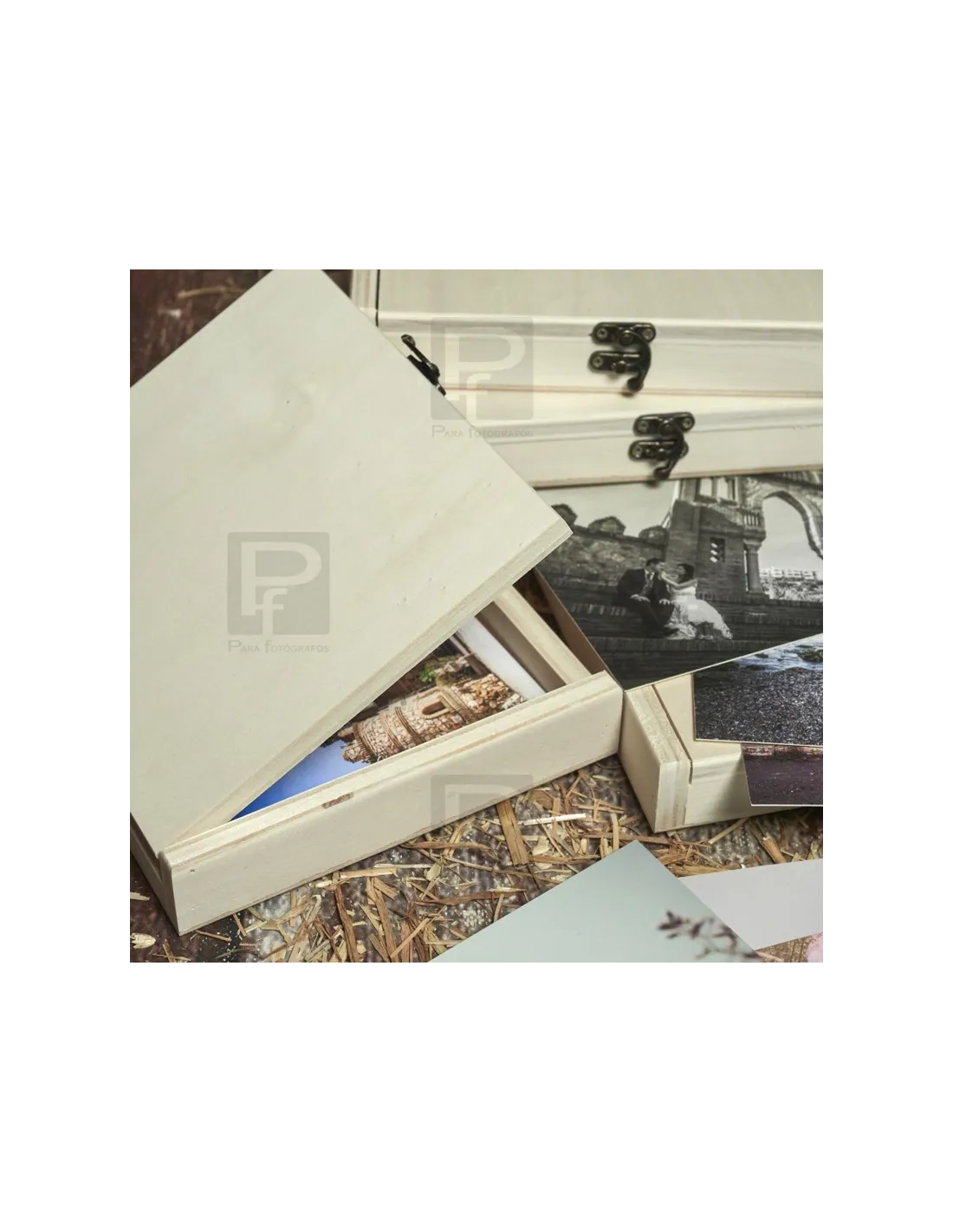 Caja de madera en pino natural, tapa y broche, para guardar láminas de tamaño hasta 15x20. La caja se presenta con varias opciones, sin personalizar o personalizada con grabado con láser.