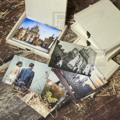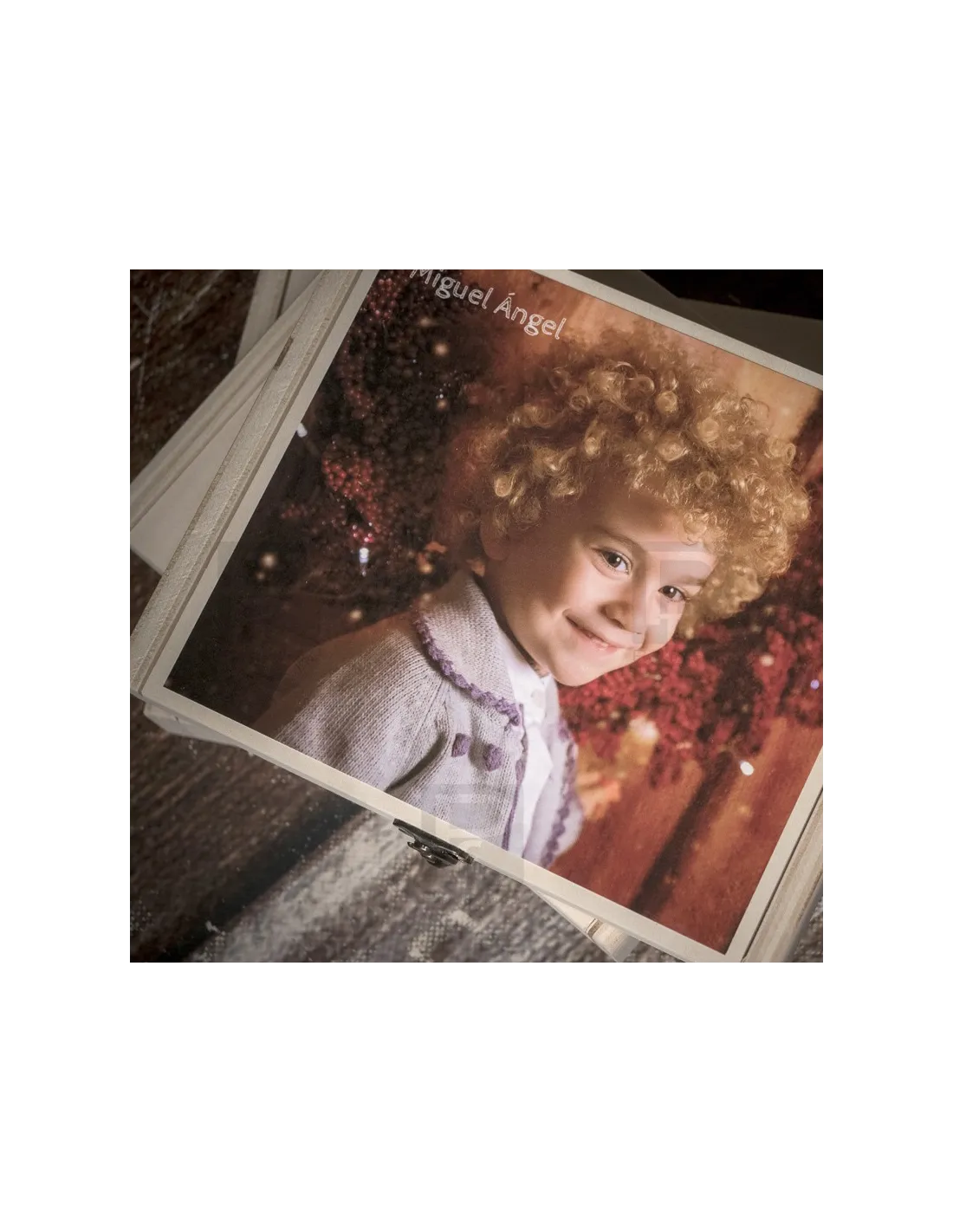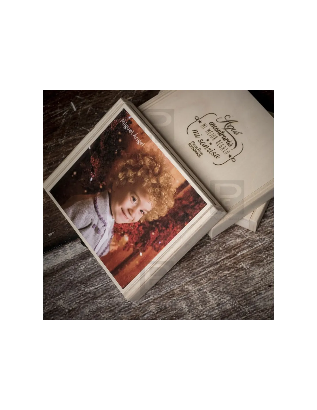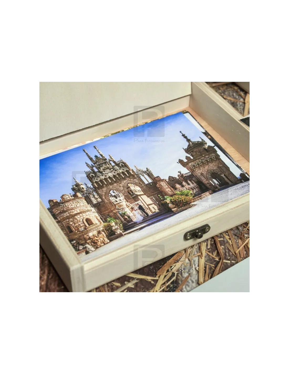 Caja de madera en pino natural, tapa y broche, para guardar láminas de tamaño hasta 15x20. La caja se presenta con varias opciones, sin personalizar o personalizada con grabado con láser.