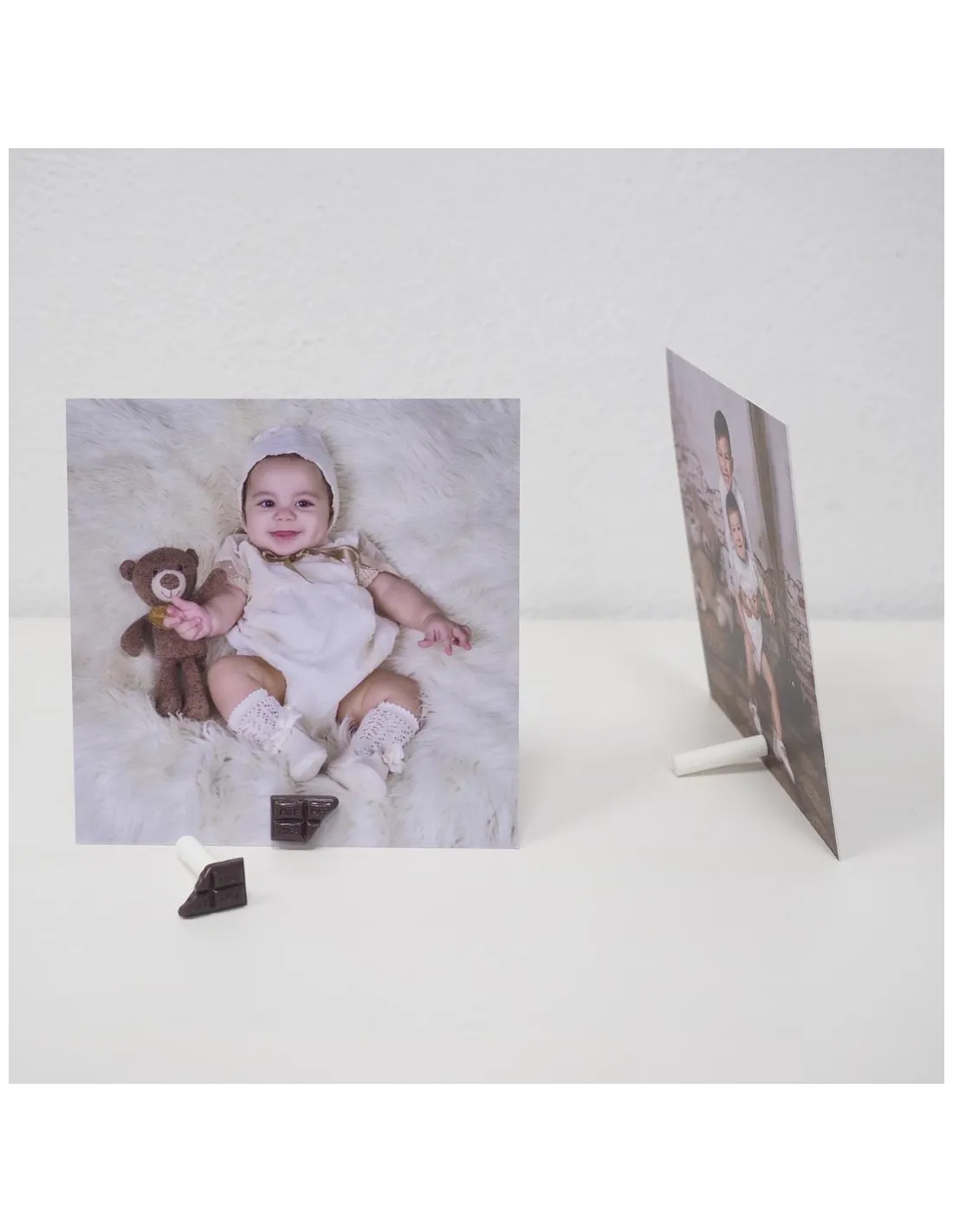 Es un soporte patentado y diseñado por nosotros, que sostiene tus láminas o fotografías de pie con un sistema muy sencillo de dos piezas. Solo haces un pequeño agujero, lo enroscas… y tu recuerdo queda listo para lucirse, incluso por las dos caras.