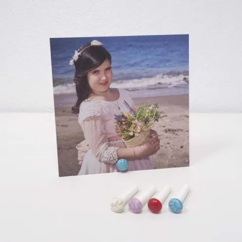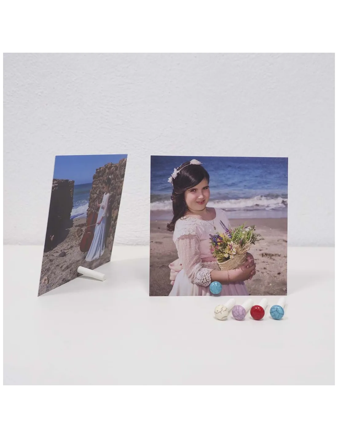 Es un soporte patentado y diseñado por nosotros, que sostiene tus láminas o fotografías de pie con un sistema muy sencillo de dos piezas. Solo haces un pequeño agujero, lo enroscas… y tu recuerdo queda listo para lucirse, incluso por las dos caras.