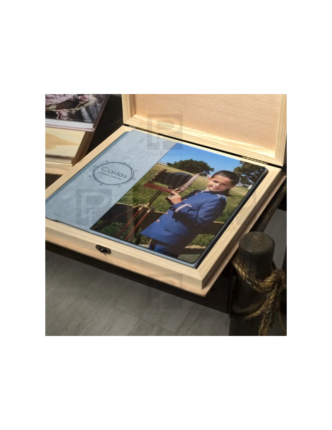 La caja se puede servir personalizada en portada a láser, además de con foto en su interior (tapa abatible), o sin personalizar. La foto de la tapa interior va pegada.