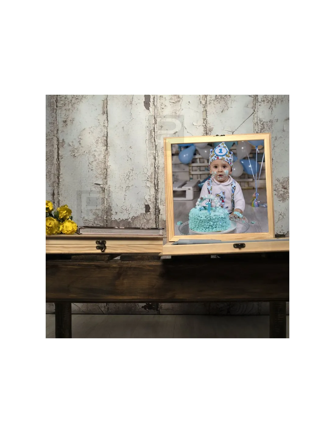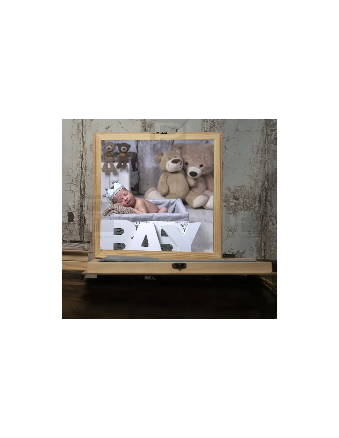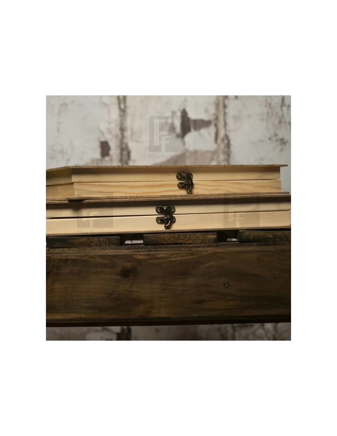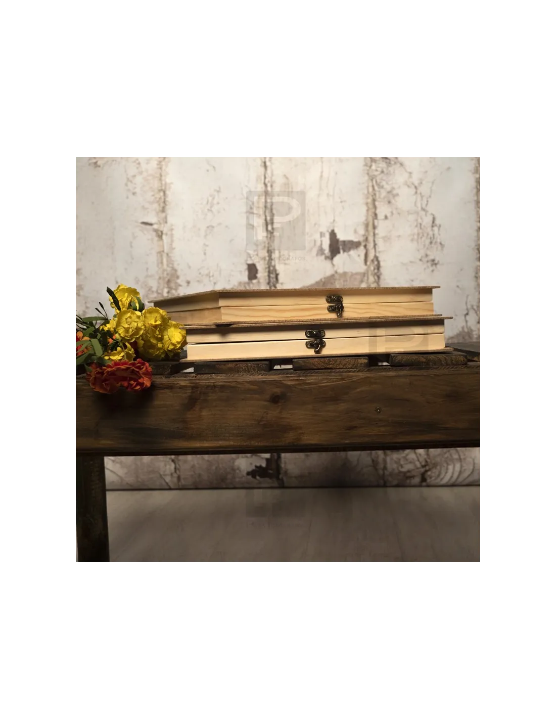 Caja de madera cuadrada abatible con 2 partes con marco que encajan para quedar el álbum en su inteiror.