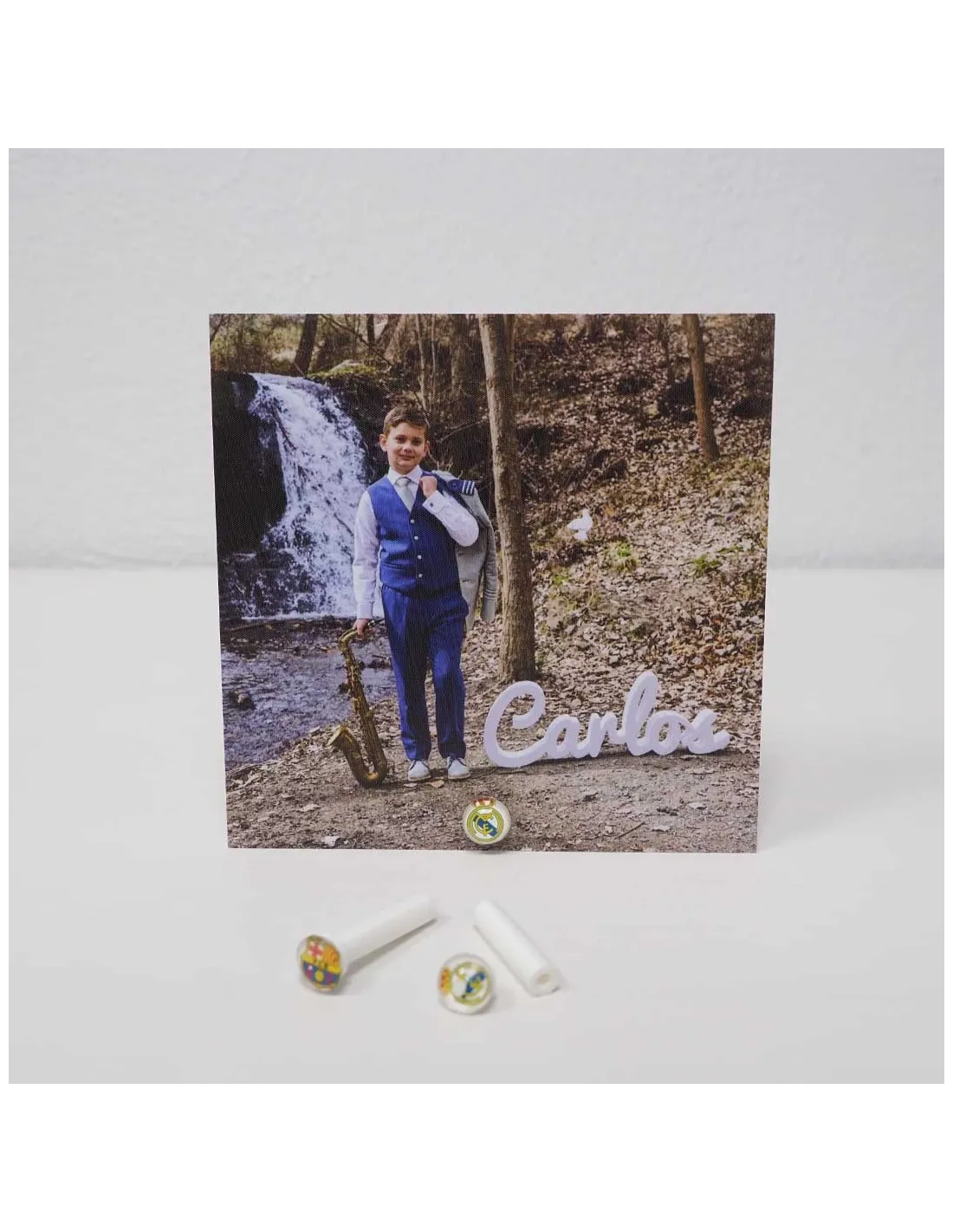 El Portaláminas para fotos es un soporte decorativo patentado, creado por Parafotógrafos, que permite mantener de pie tus fotografías, recordatorios o láminas de forma elegante y sencilla. Está formado por dos piezas que se unen roscándose, manteniendo la fotografía entre ellas de forma firme y en vertical. Al girarlo, puedes mostrar la imagen por la otra cara, ideal para recordatorios a doble cara. Fabricado en material reciclable.