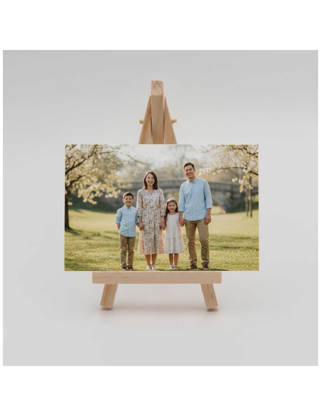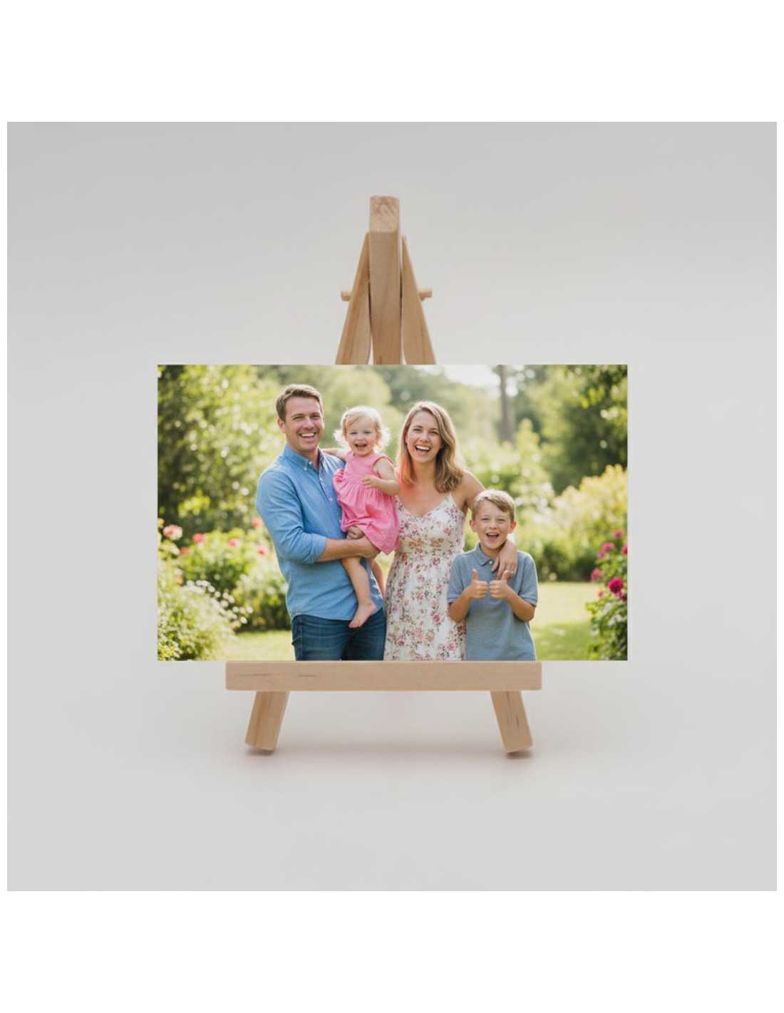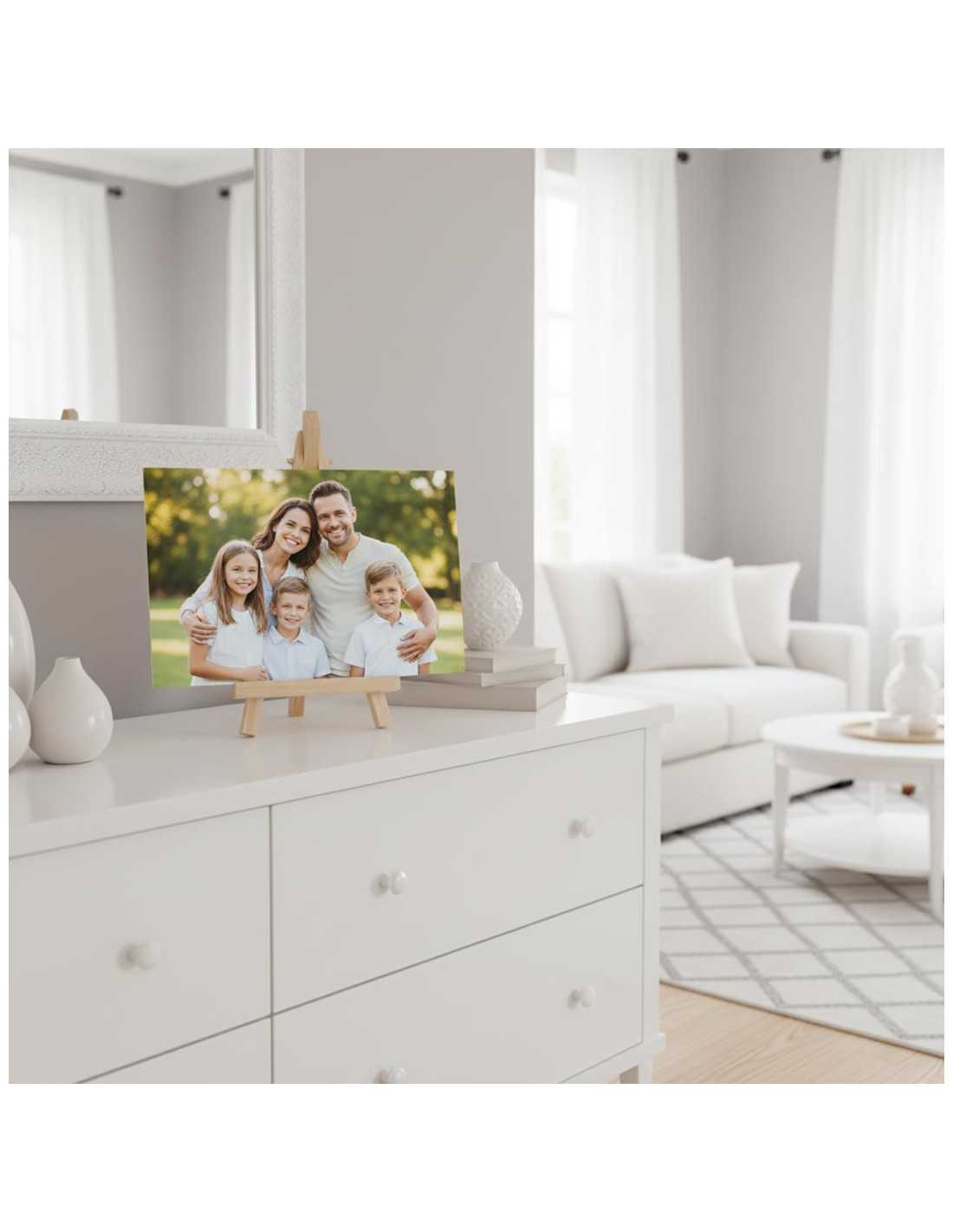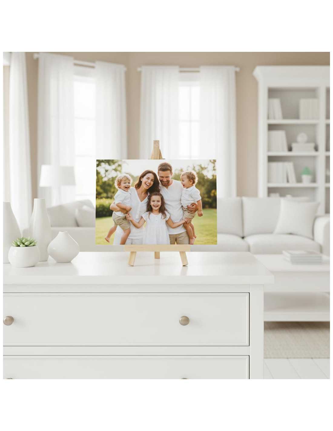Este soporte caballete de madera es la solución perfecta para exhibir tus fotografías, láminas o recordatorios de forma elegante y natural. Con un tamaño compacto de 8 cm de ancho por 15 cm de alto, es ideal para destacar imágenes de hasta 20x15 cm, tanto en formato horizontal como vertical. Su diseño sencillo y atemporal se adapta a cualquier estilo, aportando calidez y un toque artesanal a tus espacios.