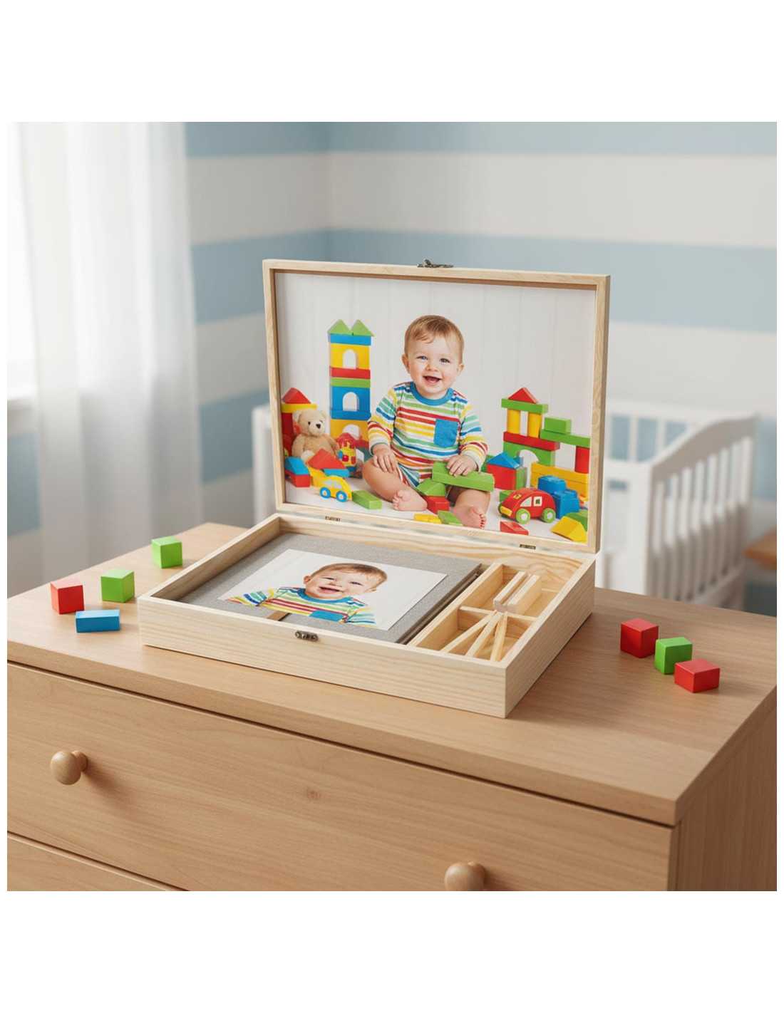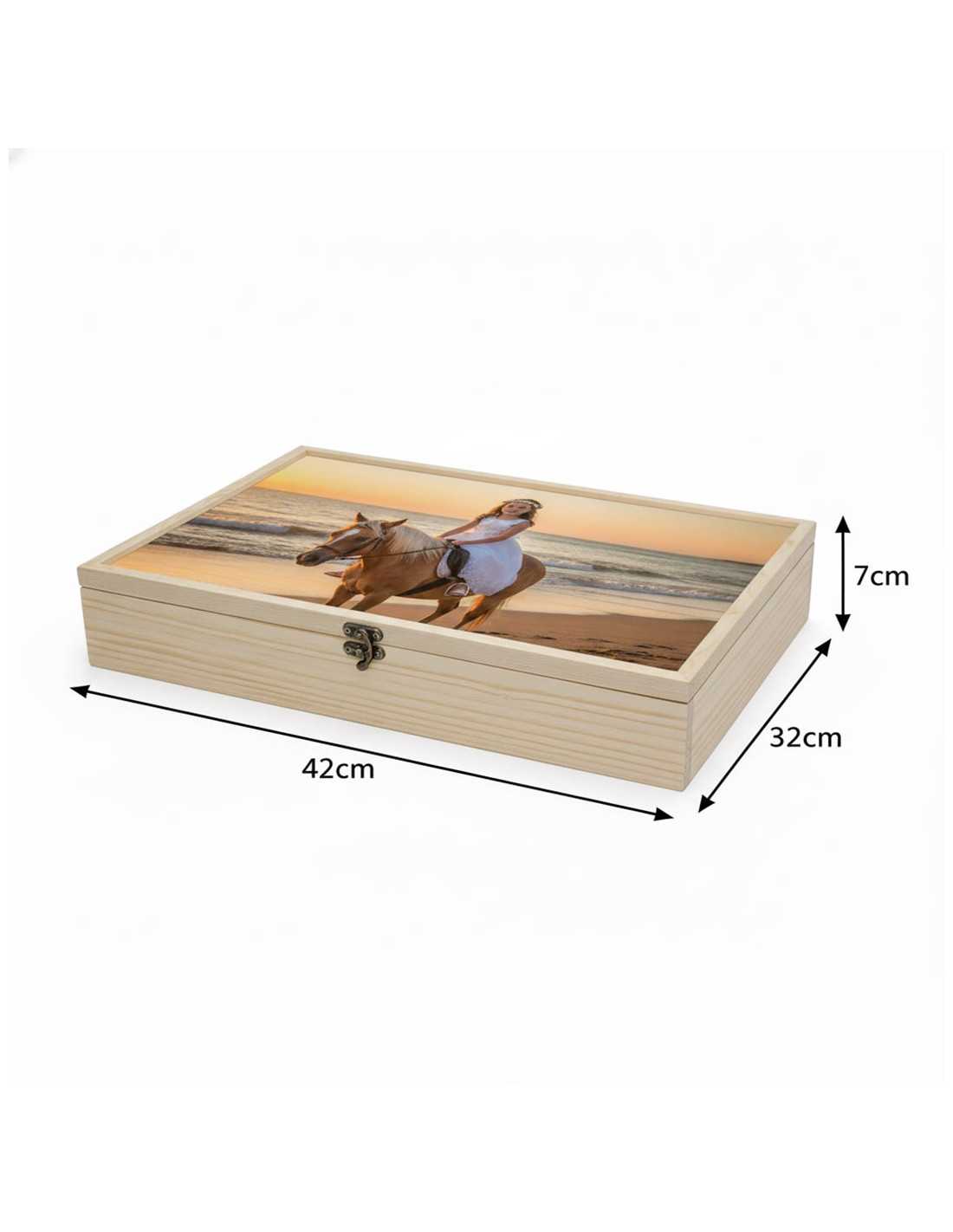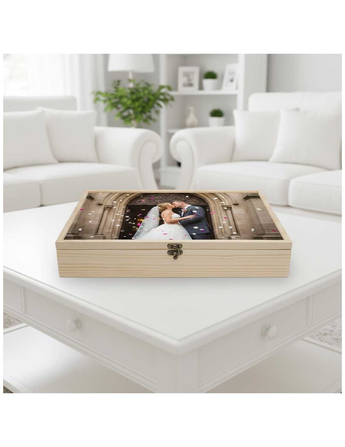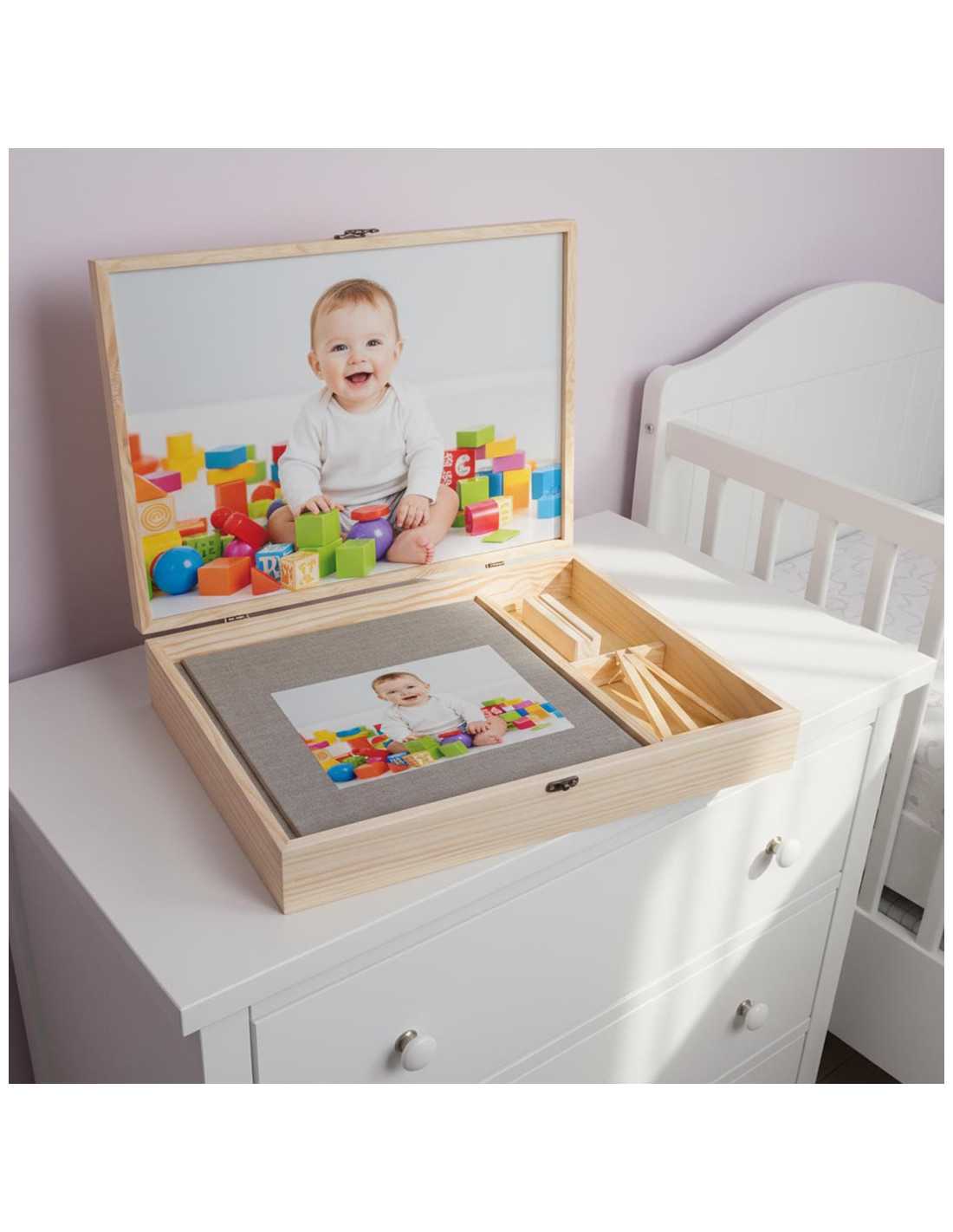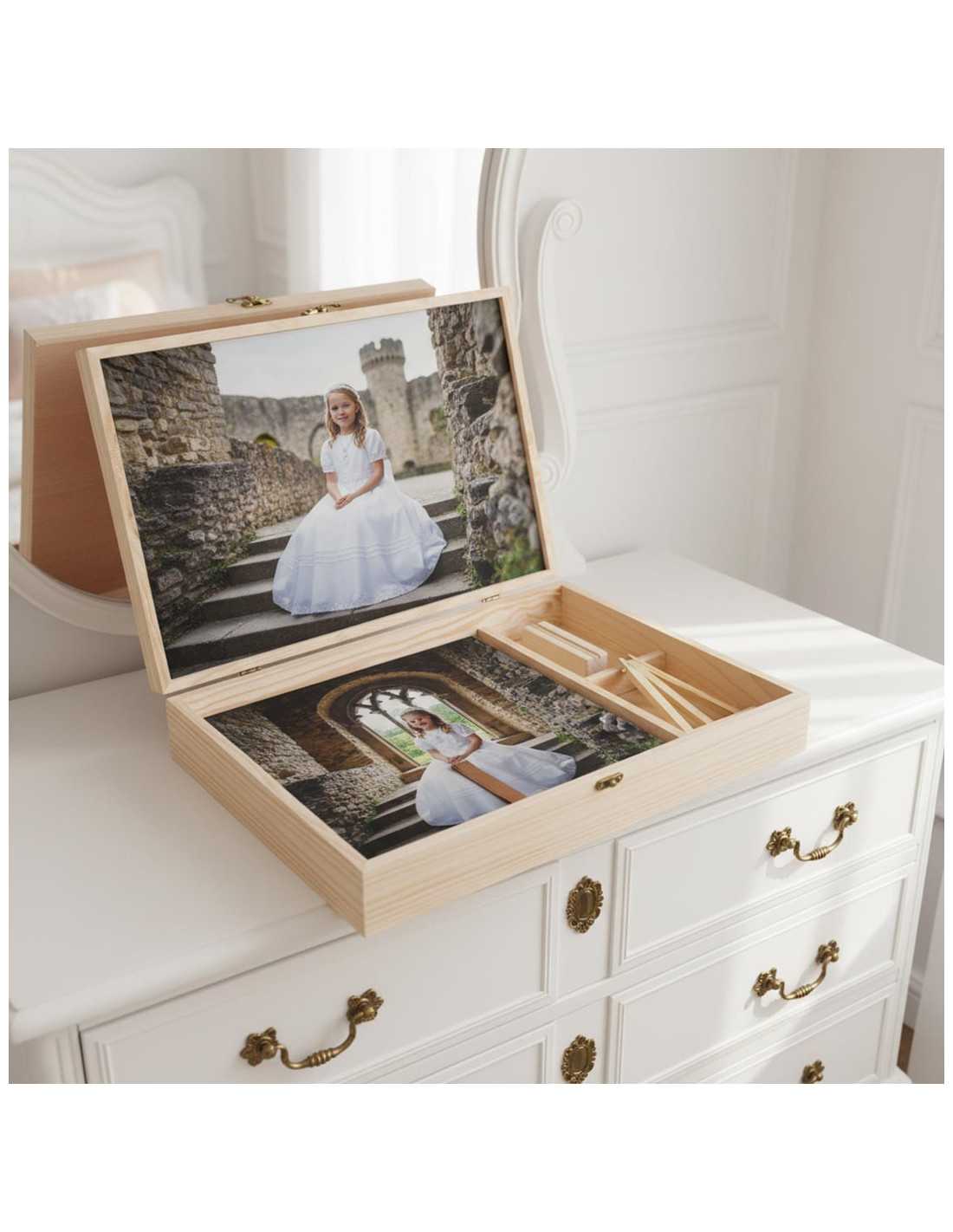 Cajas de madera para fotógrafos personalizada rectangular abatible para guardar álbum de hasta tamaño 30x30, con 2 separaciones de 9,5x15cm aproximadamente para guardar recordatorios y detalles.