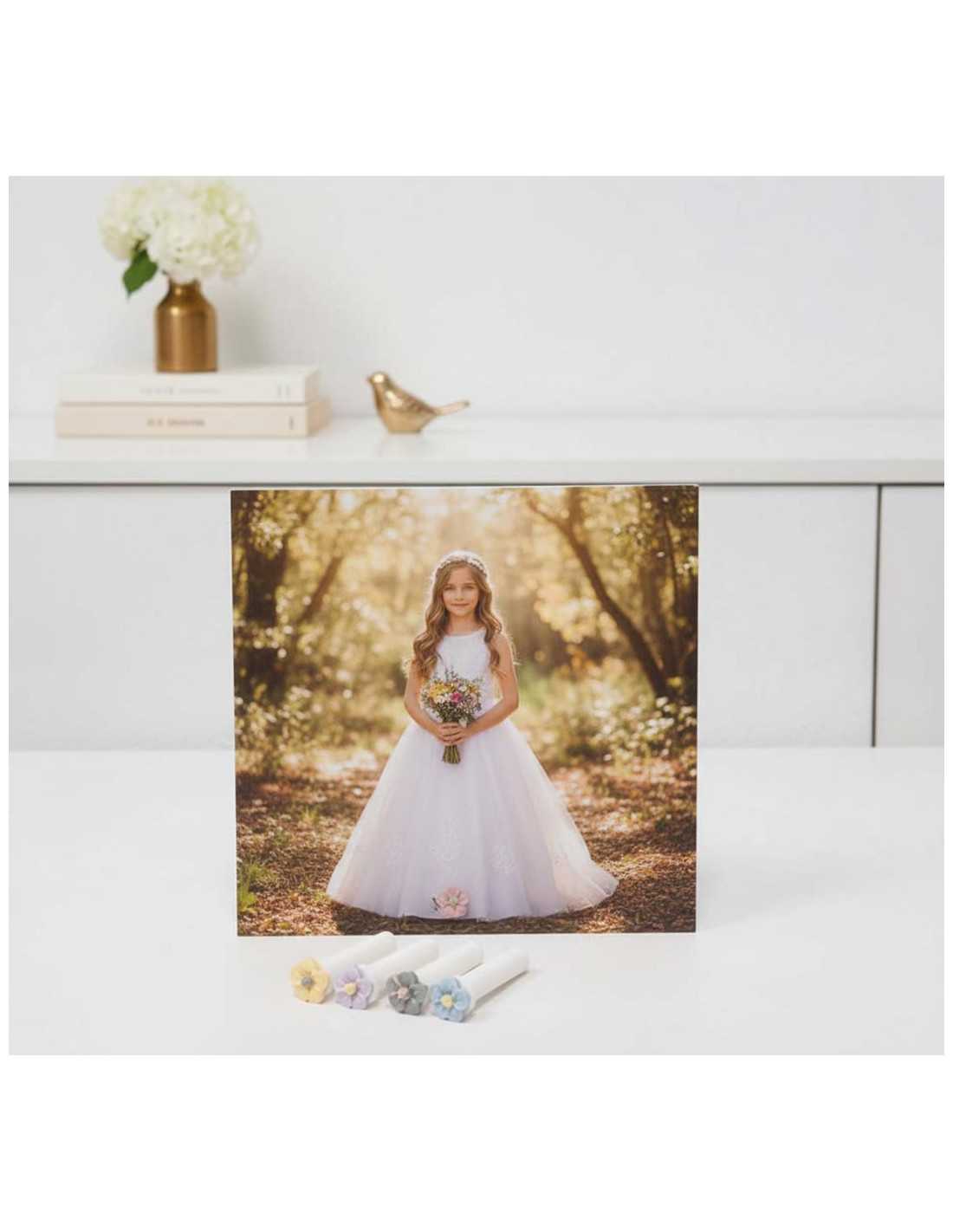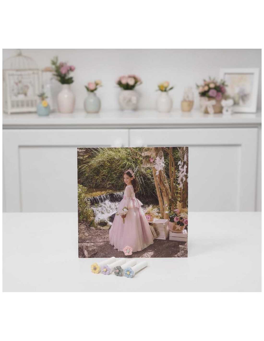 Nuestros recordatorios de comunión o bautizo en formato 13 x 13 cm combinan diseño, calidad y una presentación muy especial.
