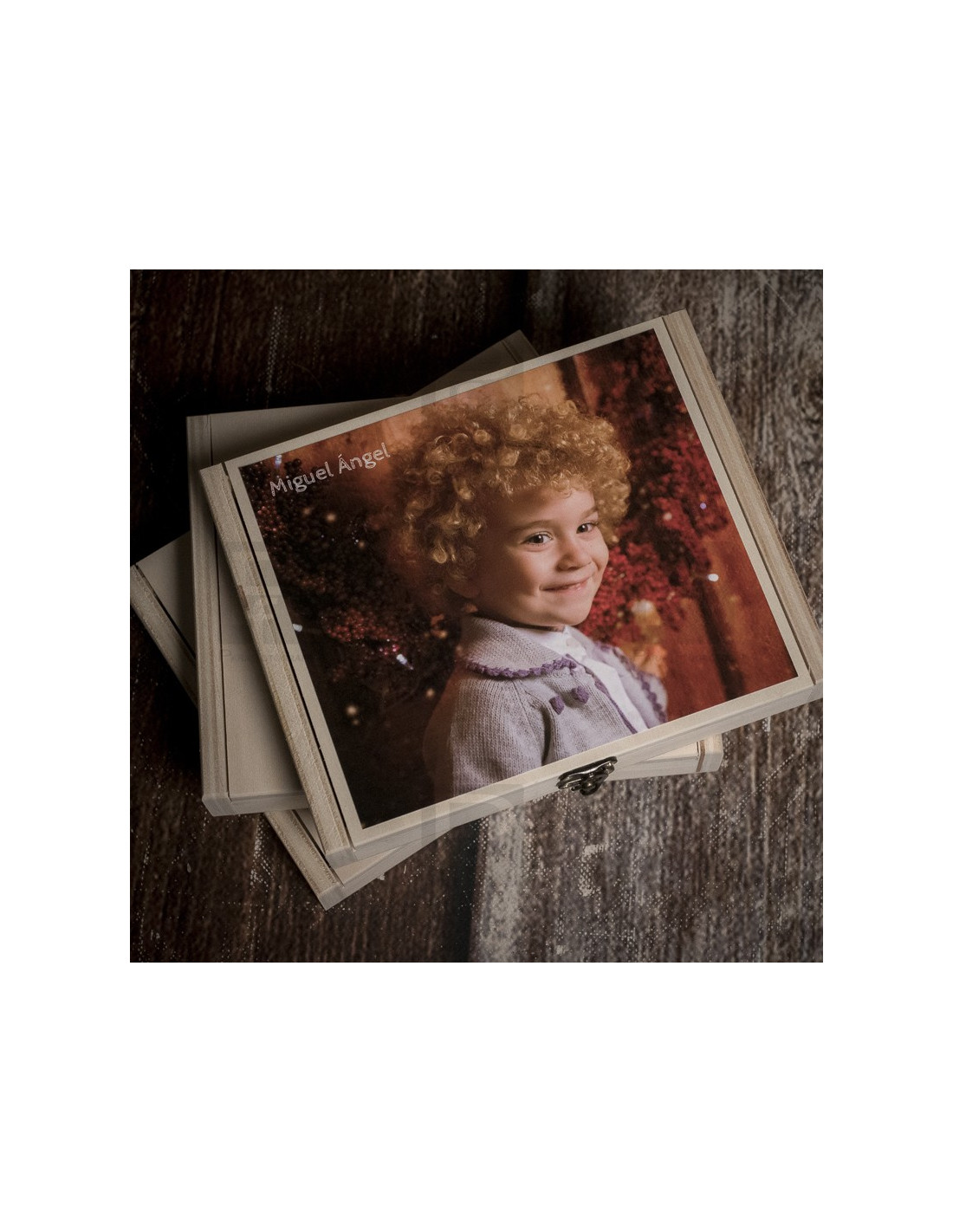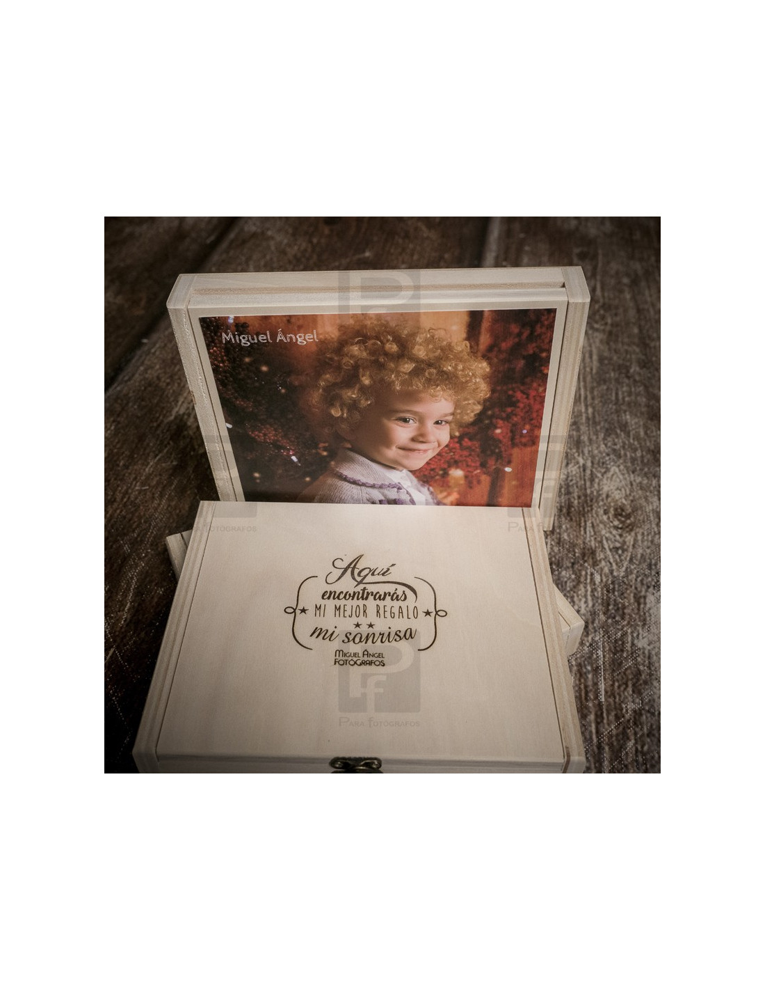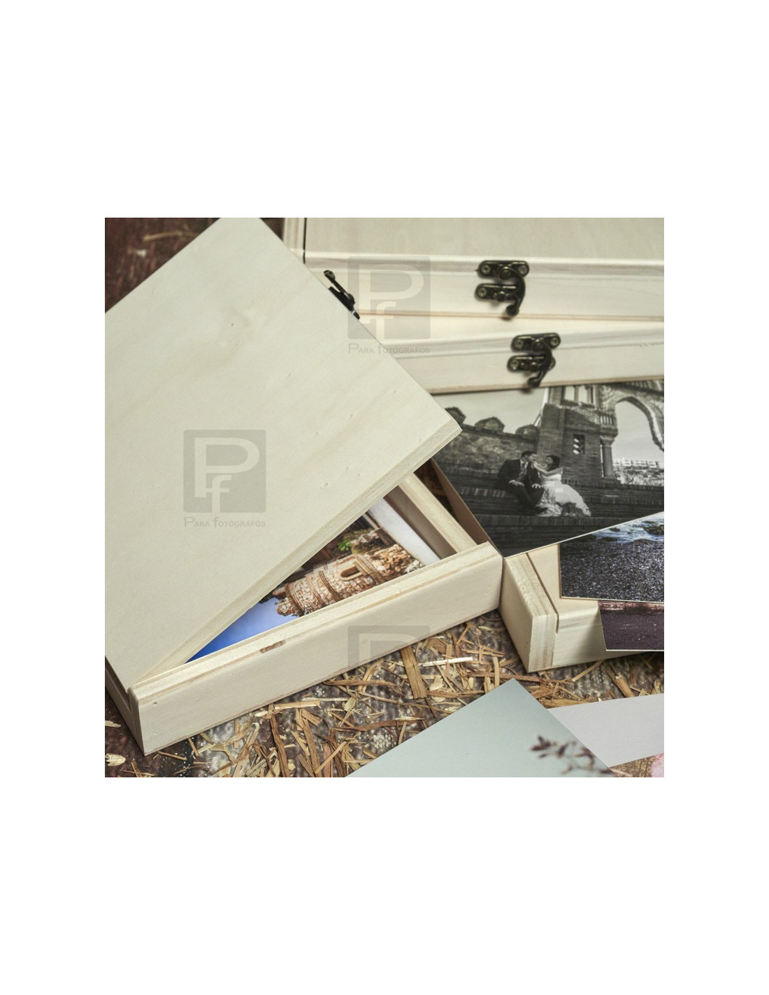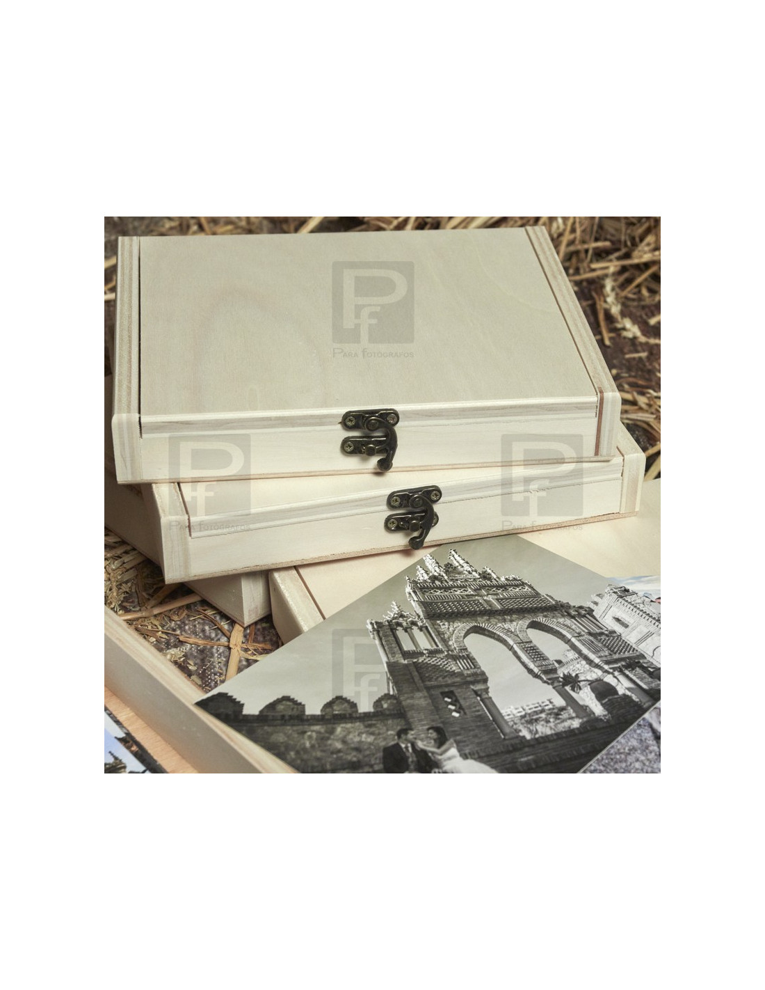 Caja de madera en pino natural, tapa y broche, para guardar láminas de tamaño hasta 15x20. La caja se presenta con varias opciones, sin personalizar o personalizada con grabado con láser.