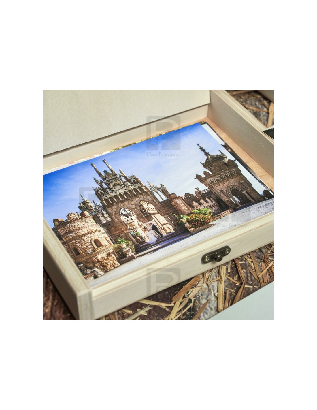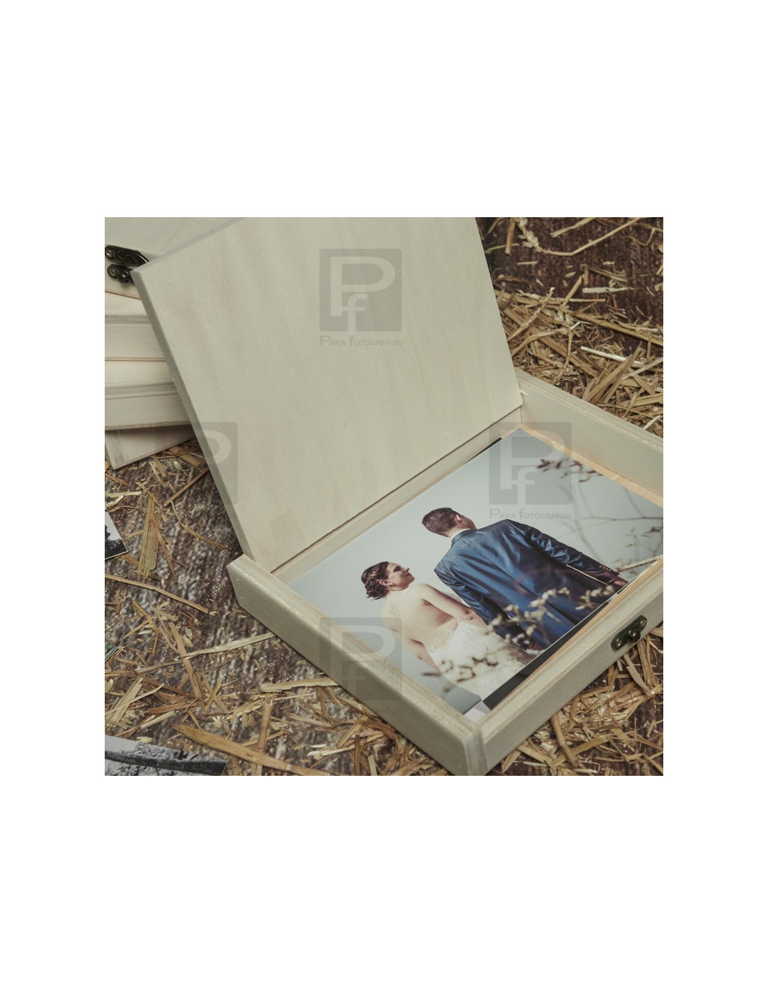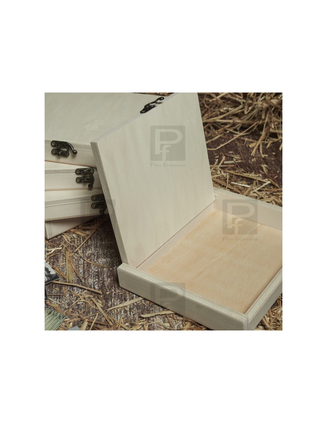 Caja de madera en pino natural, tapa y broche, para guardar láminas de tamaño hasta 15x20. La caja se presenta con varias opciones, sin personalizar o personalizada con grabado con láser.