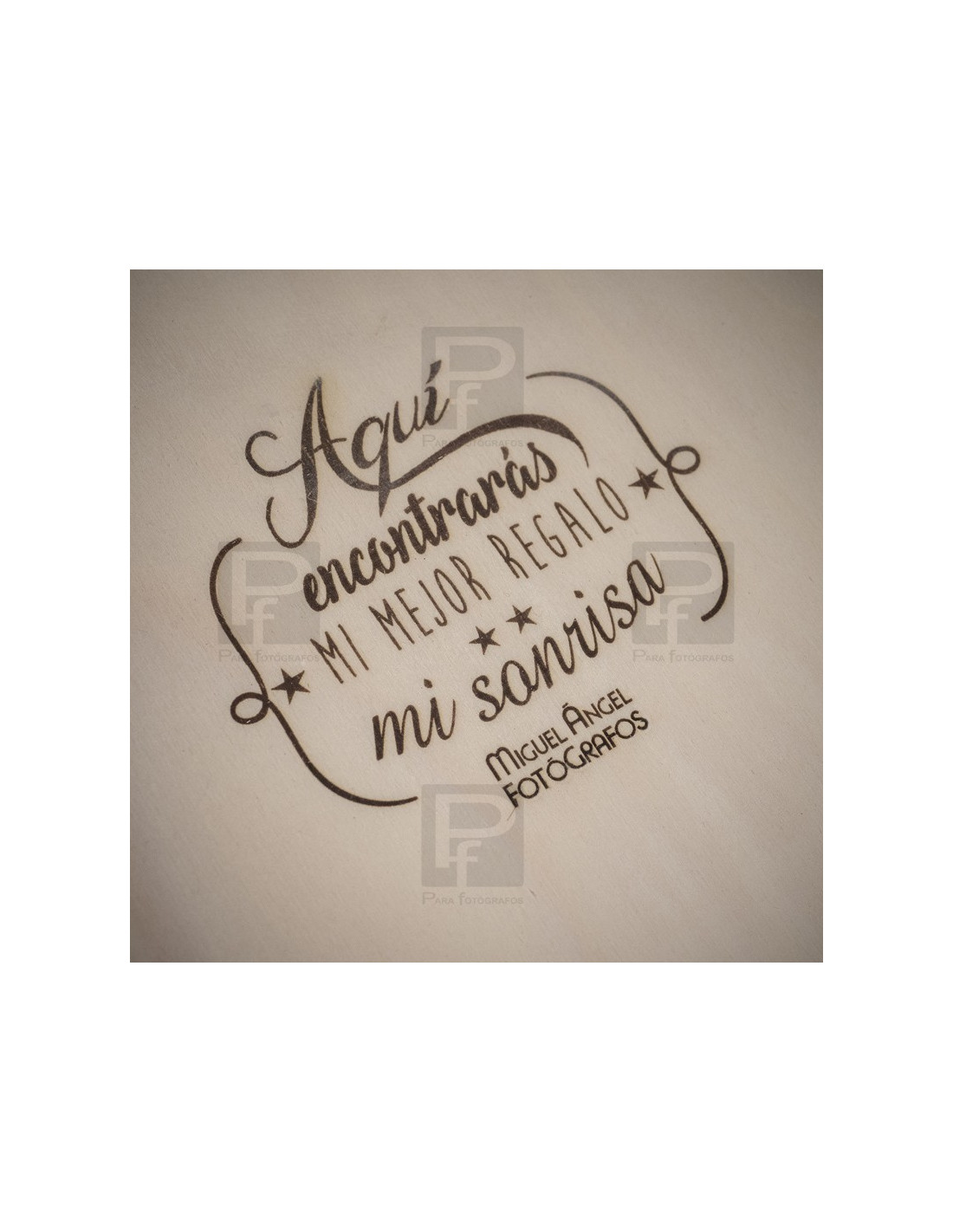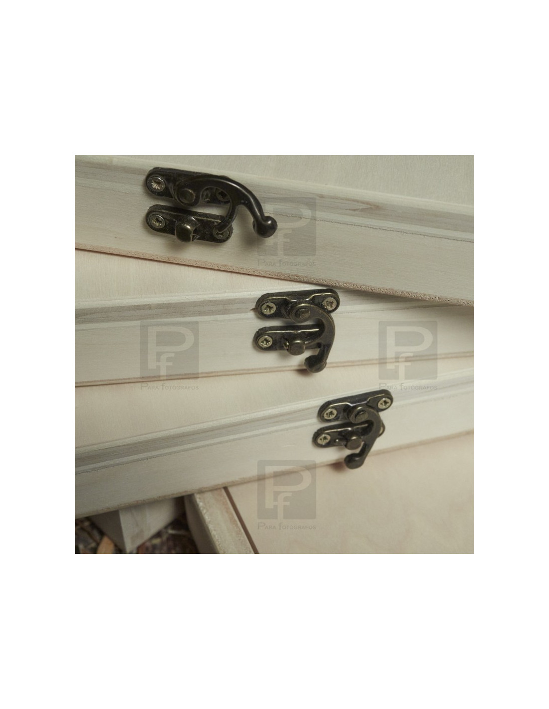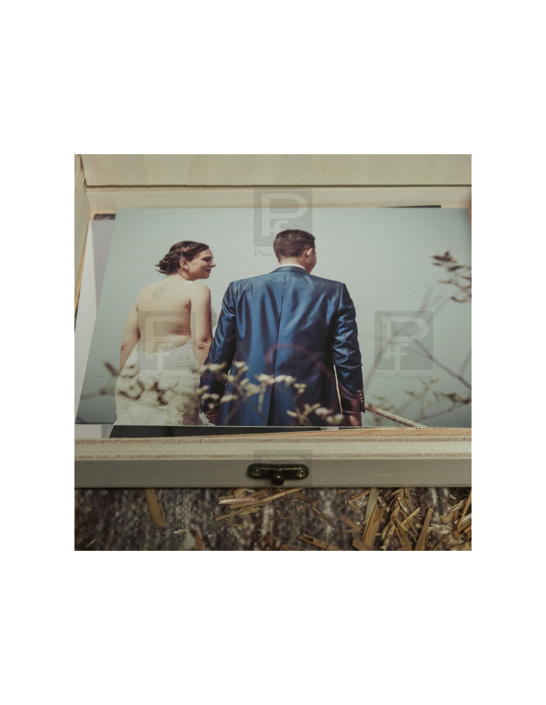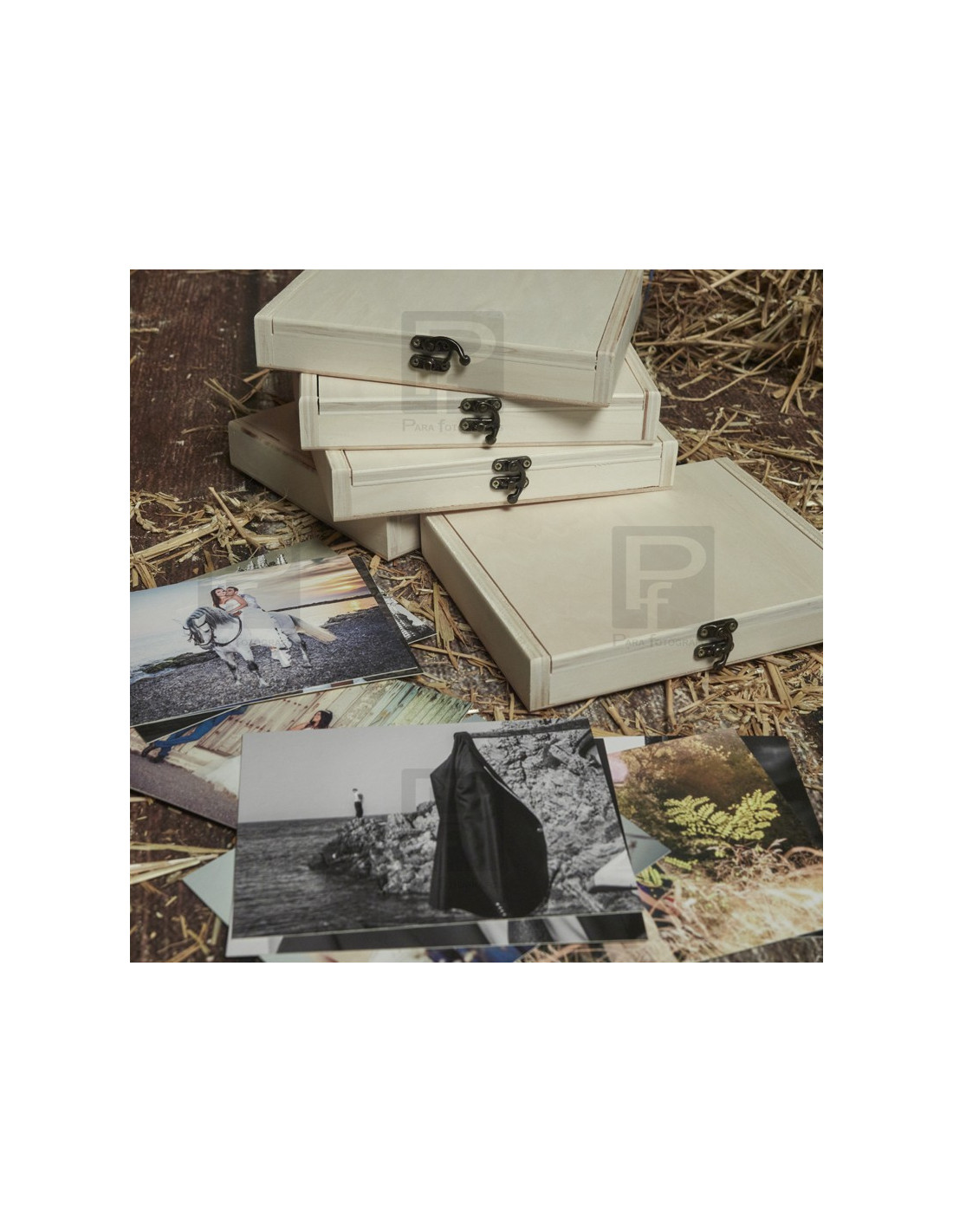 Caja de madera en pino natural, tapa y broche, para guardar láminas de tamaño hasta 15x20. La caja se presenta con varias opciones, sin personalizar o personalizada con grabado con láser.