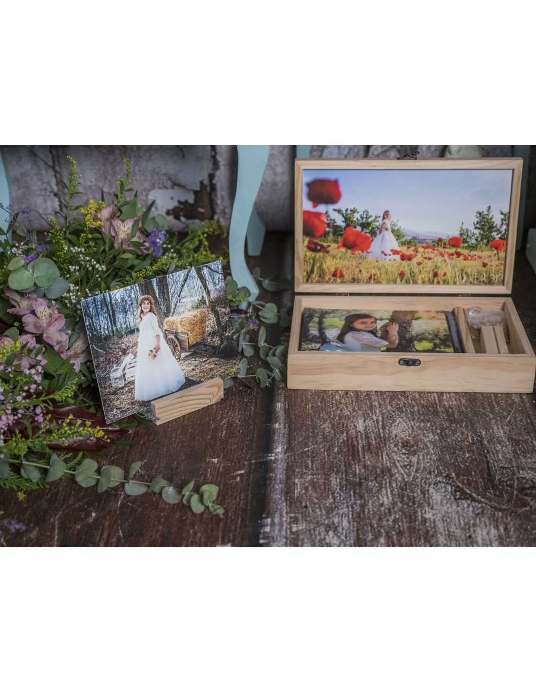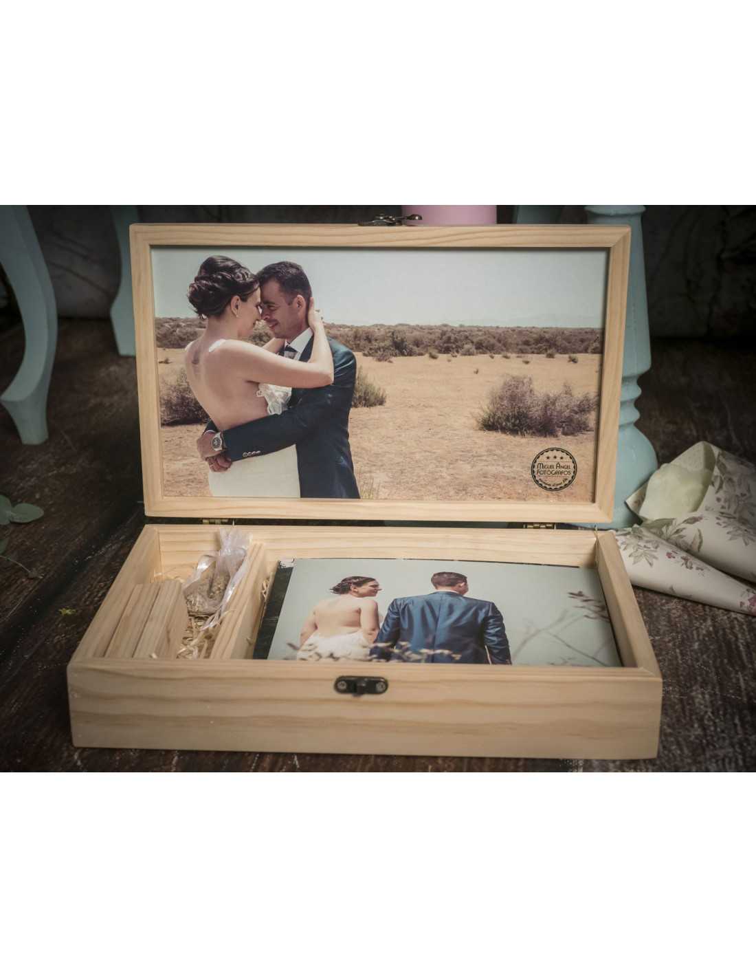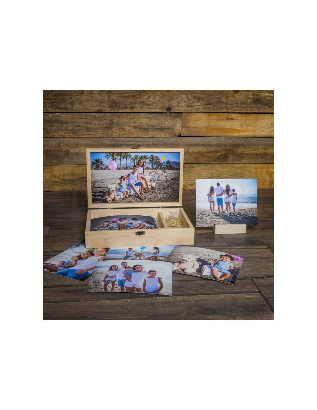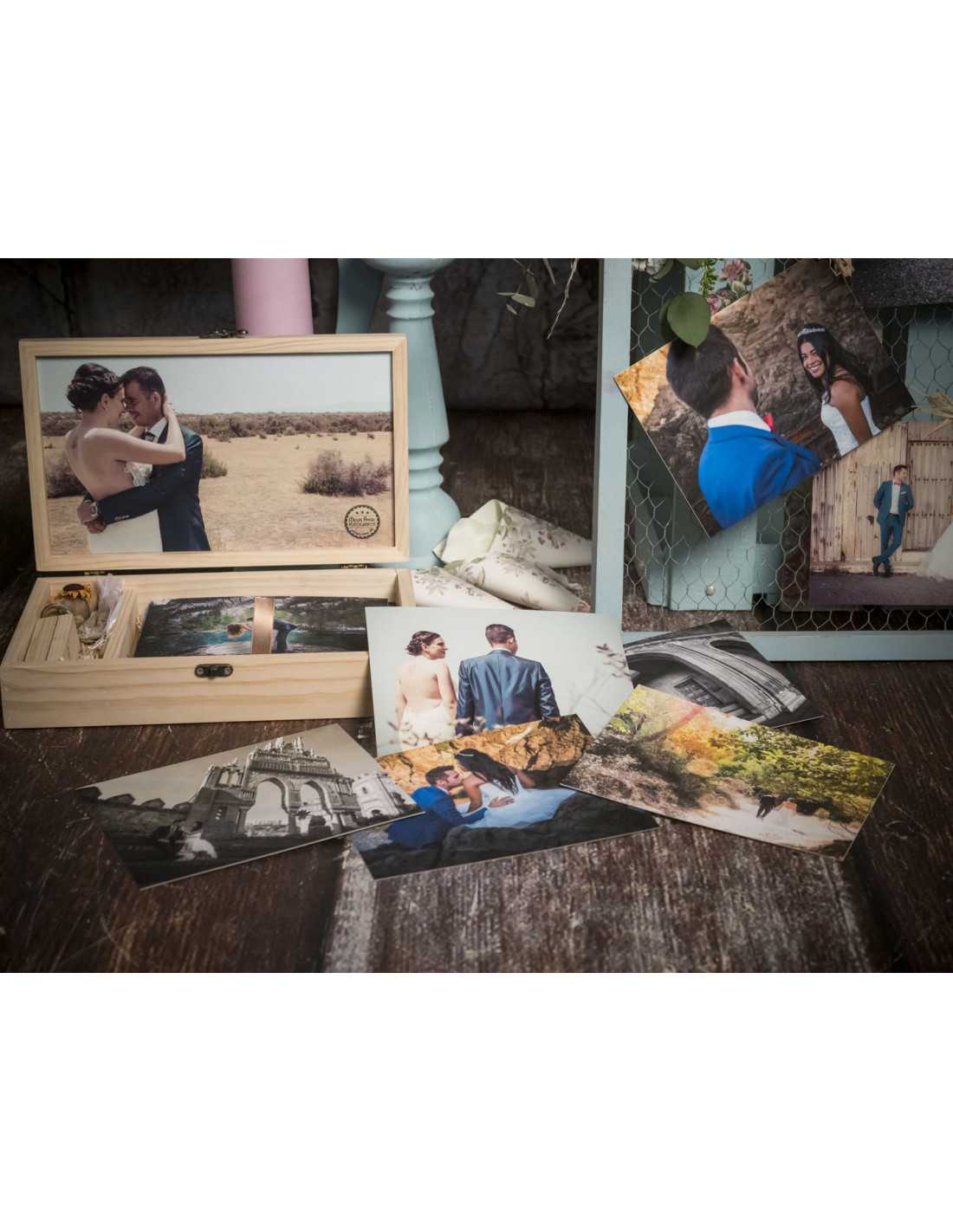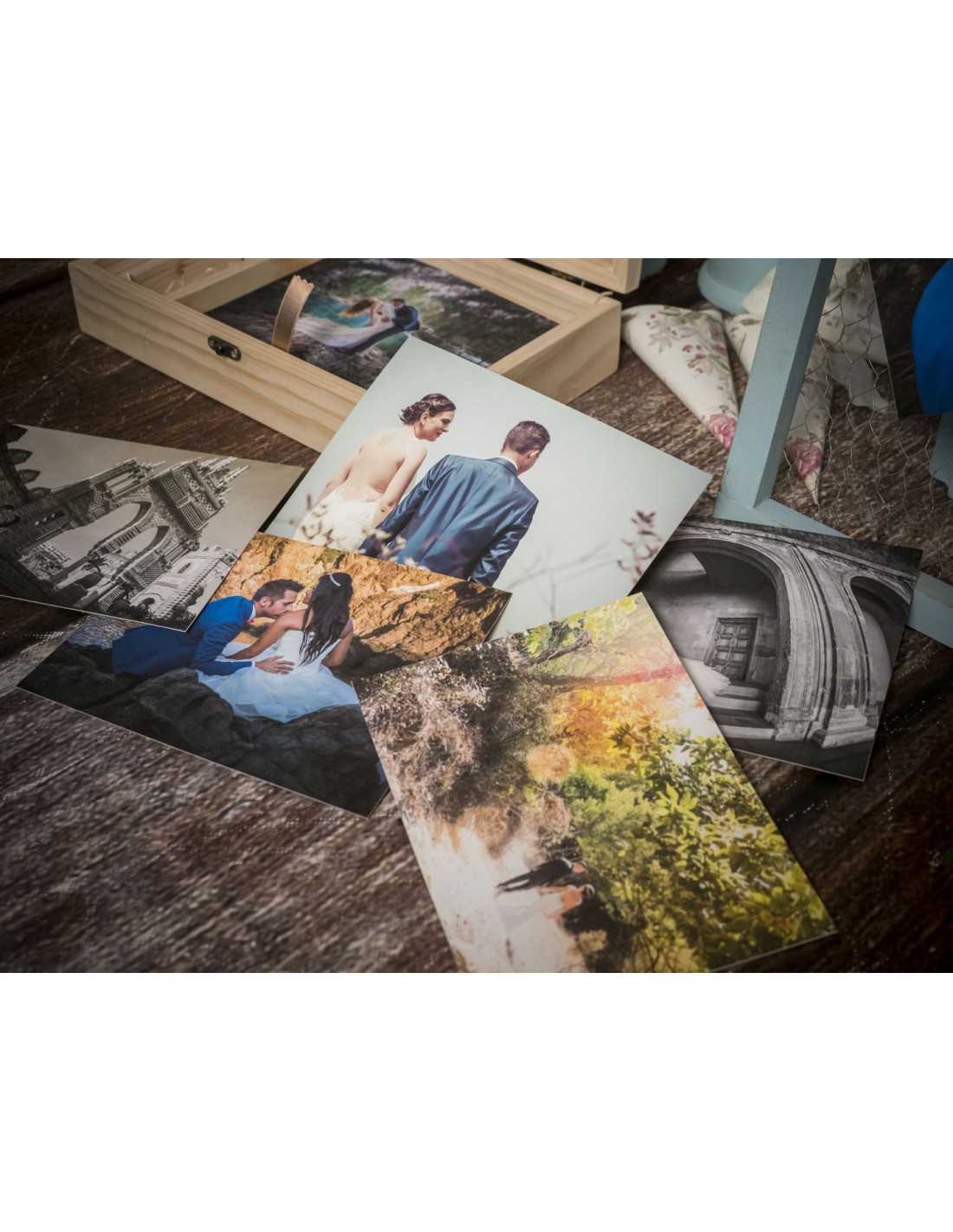 Todas nuestras cajas de madera para fotos se pueden personalizar con foto o con diseño, tanto en fotografía mate como en acabado brillante con similitud al metacrilato.