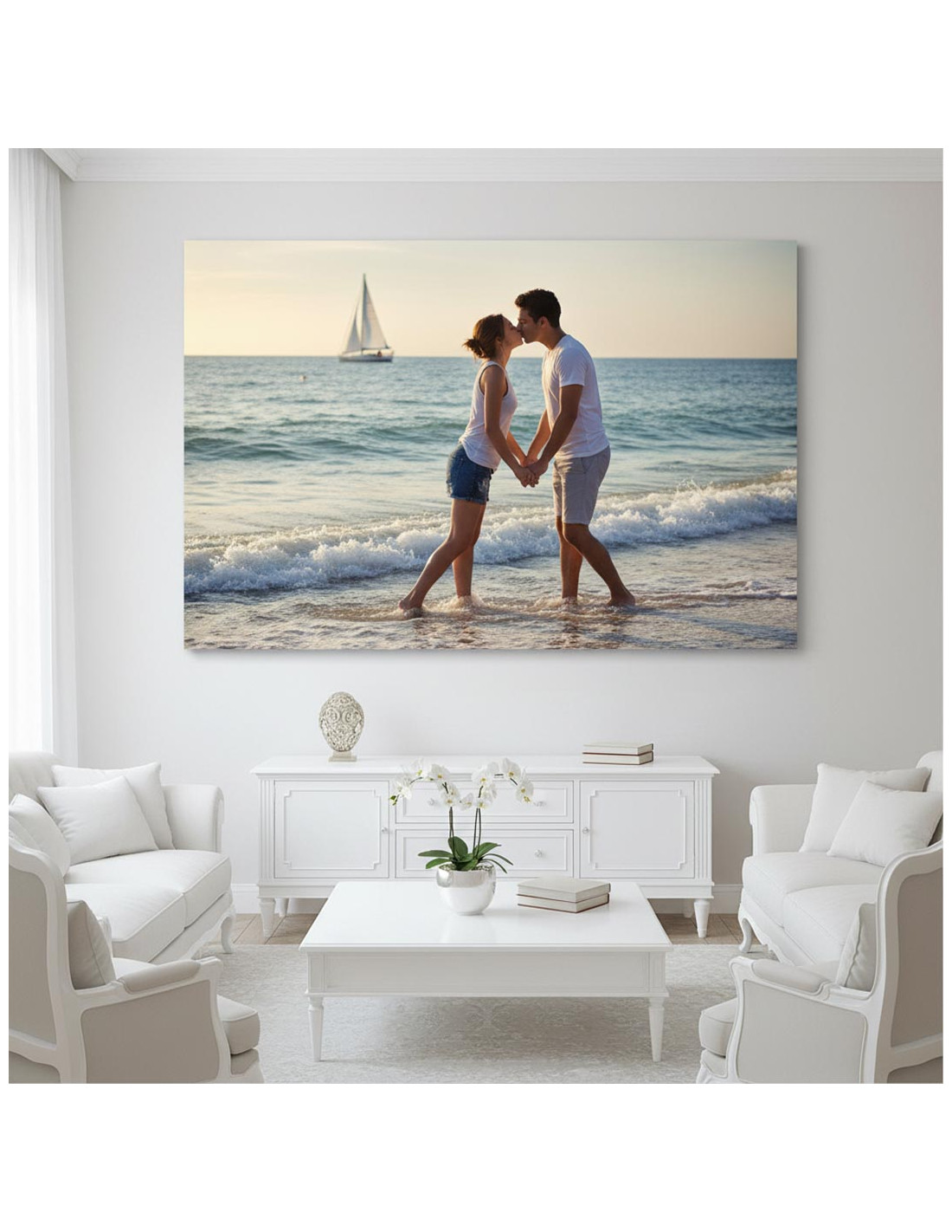 Transforma tus recuerdos en una obra de arte. Imprimimos tu fotografía en canvas de alta calidad, impresión directa sobre lienzo (tela) y la montamos sobre un bastidor de madera de 2 cm, con los cantos forrados para un acabado continuo y elegante. Cada pieza se barniza para protegerla del polvo, la humedad y la radiación UV, garantizando colores vivos y duraderos.