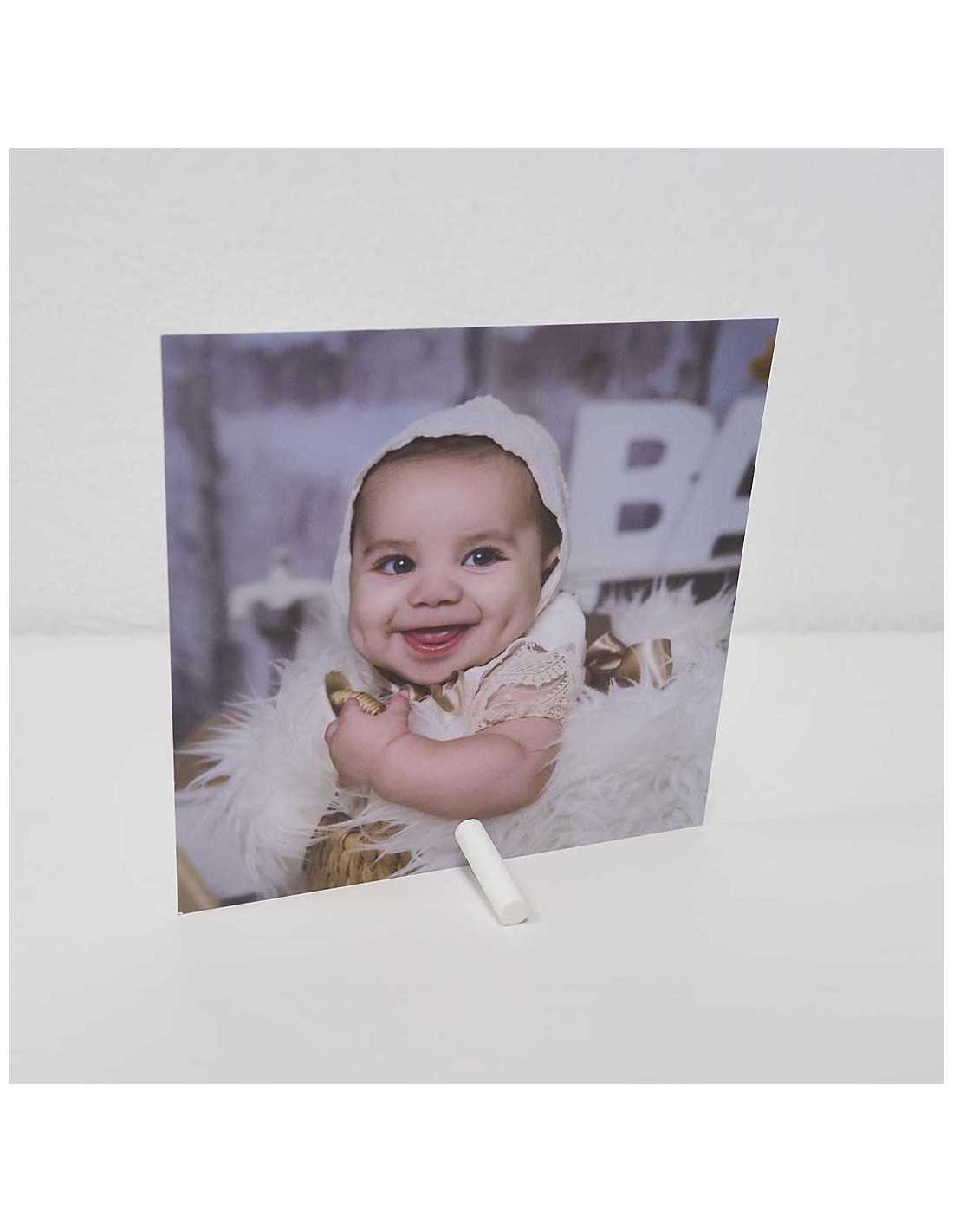 Es un soporte patentado y diseñado por nosotros, que sostiene tus láminas o fotografías de pie con un sistema muy sencillo de dos piezas. Solo haces un pequeño agujero, lo enroscas… y tu recuerdo queda listo para lucirse, incluso por las dos caras.