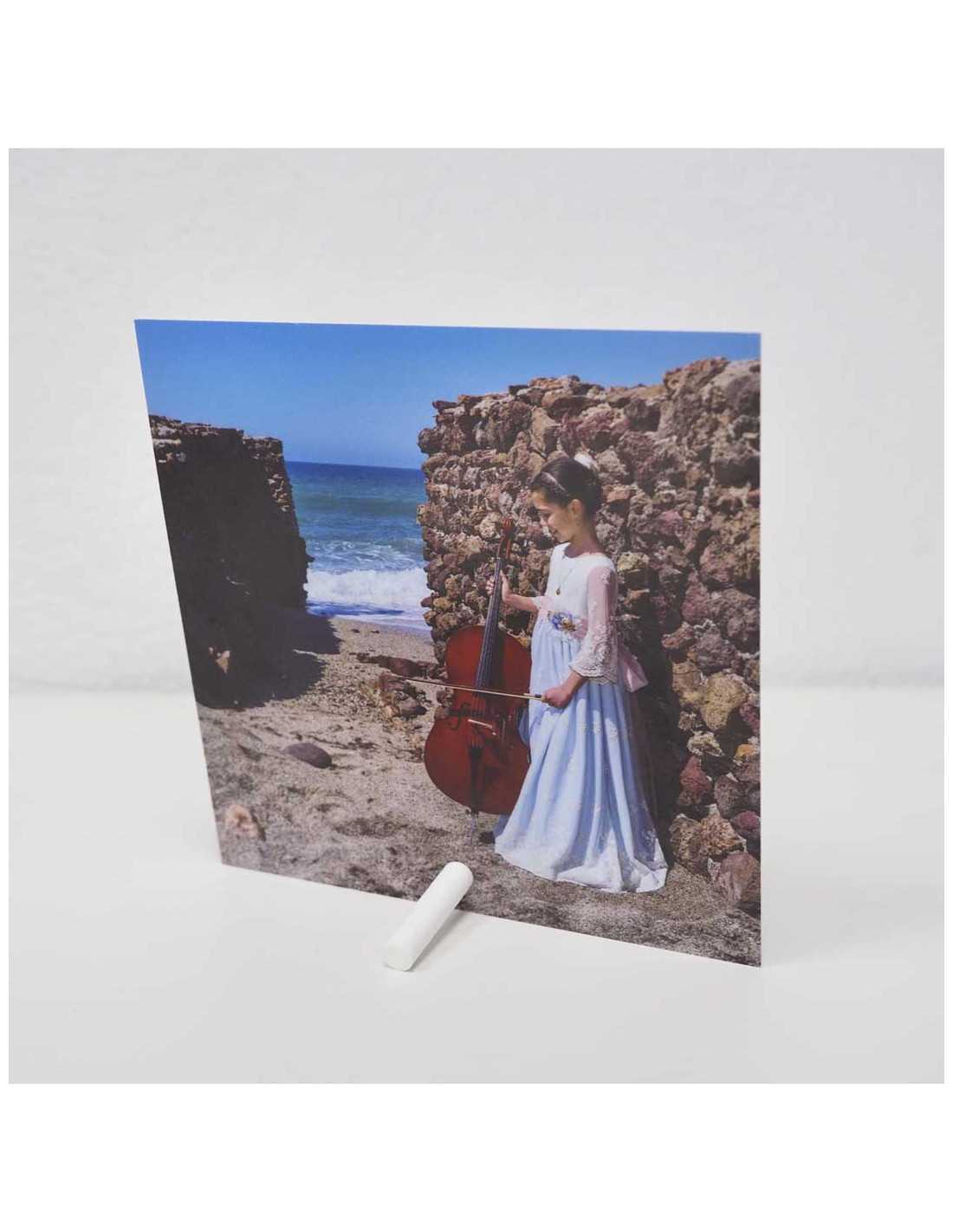 Es un soporte patentado y diseñado por nosotros, que sostiene tus láminas o fotografías de pie con un sistema muy sencillo de dos piezas. Solo haces un pequeño agujero, lo enroscas… y tu recuerdo queda listo para lucirse, incluso por las dos caras.